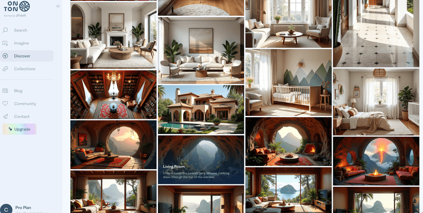 With Discover, the images displayed are not influenced by your personal aesthetic or design habits, but instead a collection of AI images generated by other Onton users. This results in a rich blend of design inspiration that’s never curated by an algorithm. Even better, you can shop many of the products in the renderings.