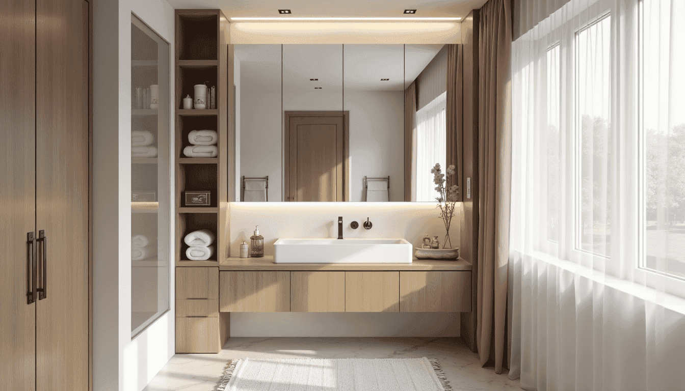 Utilize built-in shelves and cabinetry to keep the space uncluttered. Opt for minimalist designs that blend seamlessly with your bathroom decor.