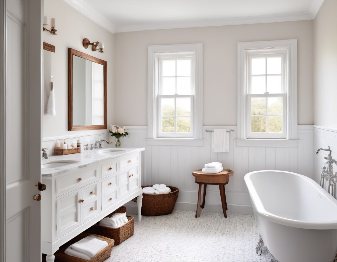 Accessories like woven storage baskets and vintage mirrors enhance the rustic aesthetic. Consider placing a plush, vintage-style stool for added comfort and charm. Finally, accent your space with vintage bath towels, emphasizing classic design elements that elevate the room.