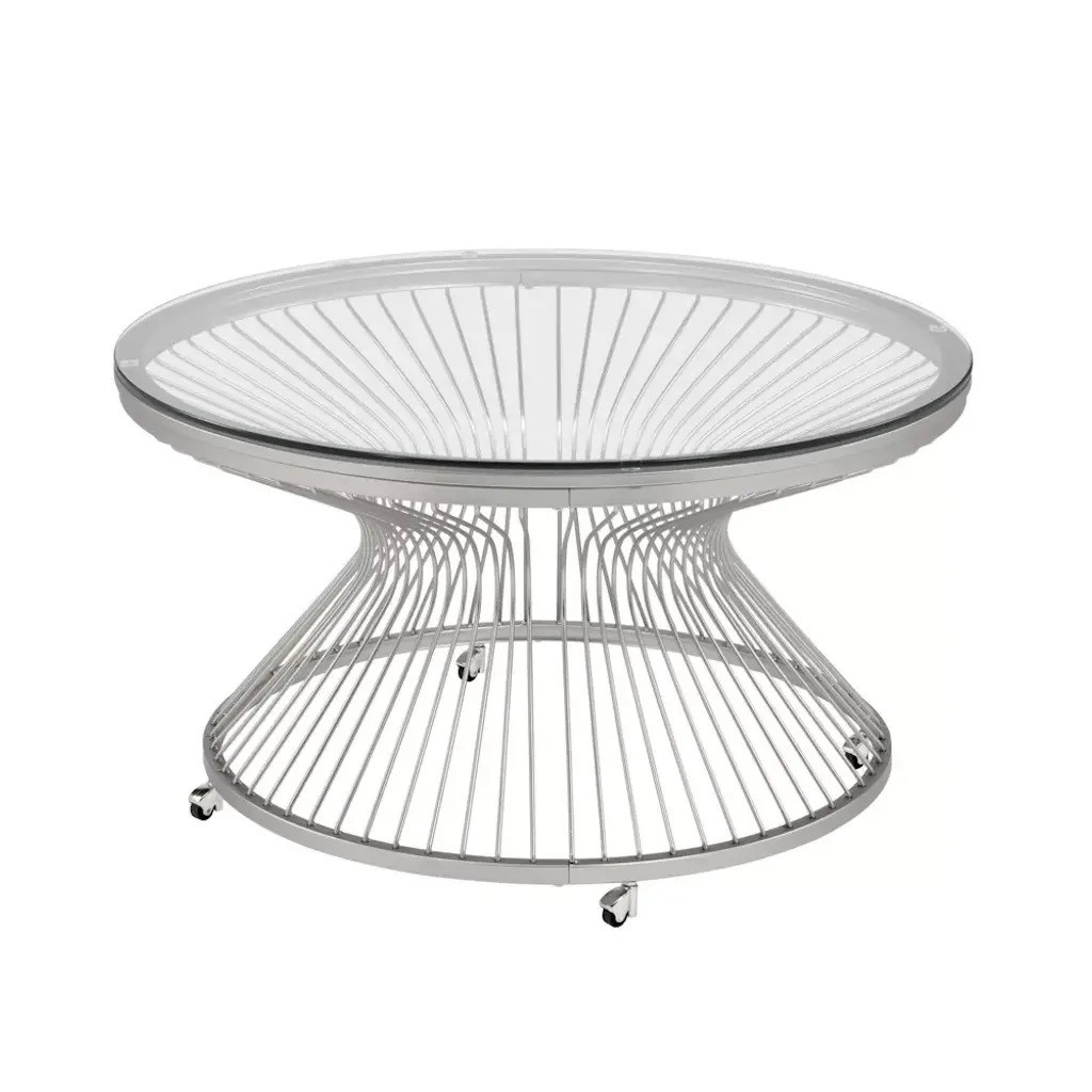 The Poppy Round Coffee Table features a sleek, tempered glass top and an intricate base design, offering a blend of style and functionality. Its compact, round shape makes it perfect for smaller living rooms, while the casters allow for easy mobility, providing a versatile and chic addition to any space.