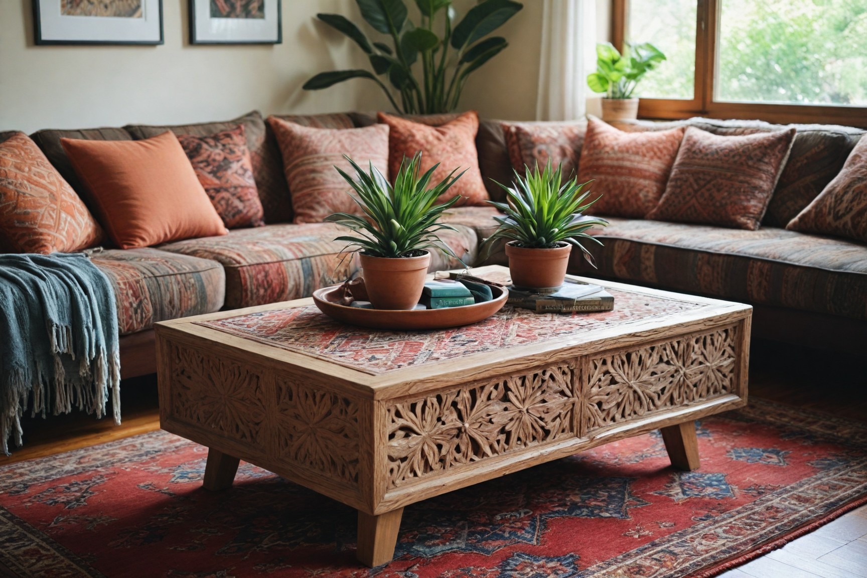 Bohemian coffee tables are artistic and eclectic, often handmade from materials like rattan or featuring carved wood designs. These tables bring a free-spirited and laid-back vibe to any space. To enhance the boho aesthetic, accessorize with layered rugs, plants, and a mix of vibrant textiles for a relaxed and inviting atmosphere.