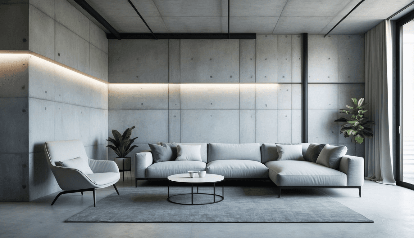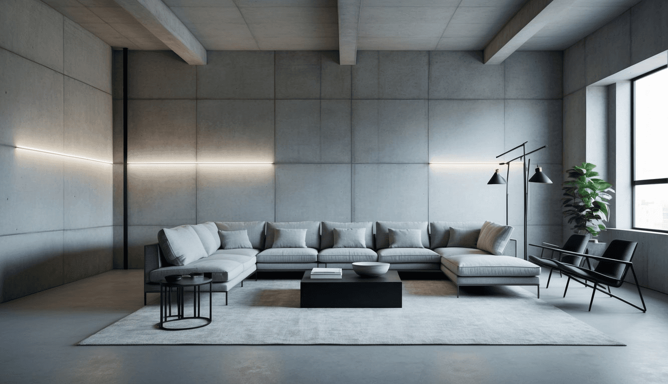 Transform your living room into a brutalist showcase with exposed concrete walls and floors. Choose a low-profile sofa in a neutral tone to complement the stark backdrop.