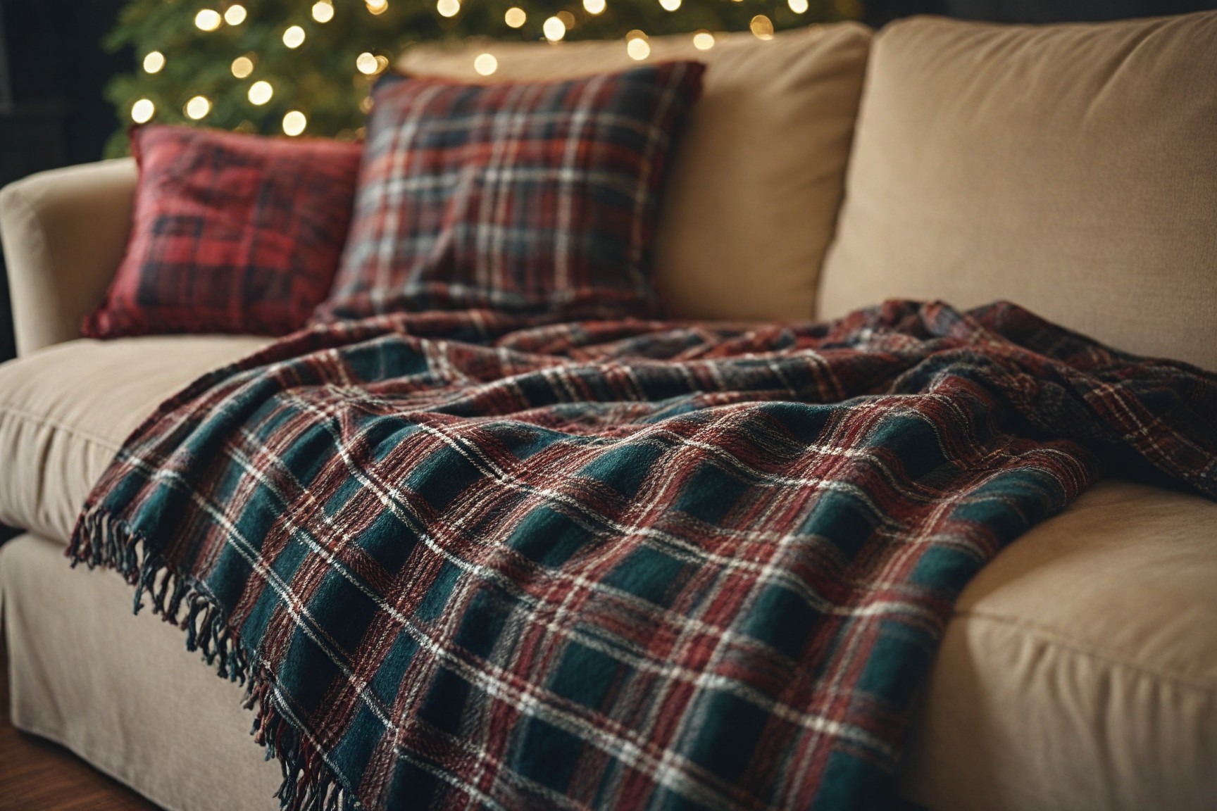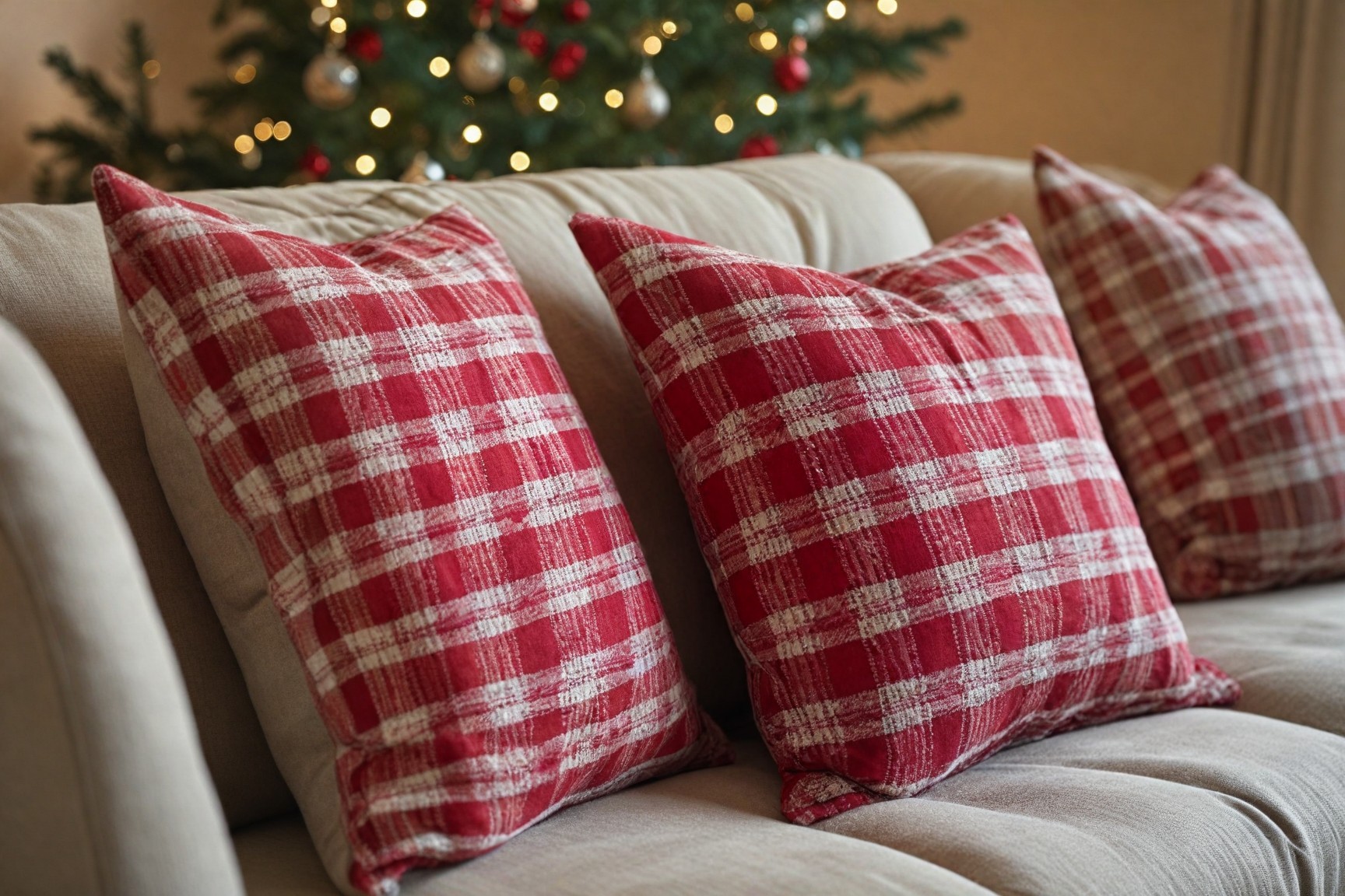 Switch out your usual cushions and throws for holiday-themed versions. A few plaid, red, or white cushions can instantly make the space feel more Christmas-ready without adding more décor pieces.