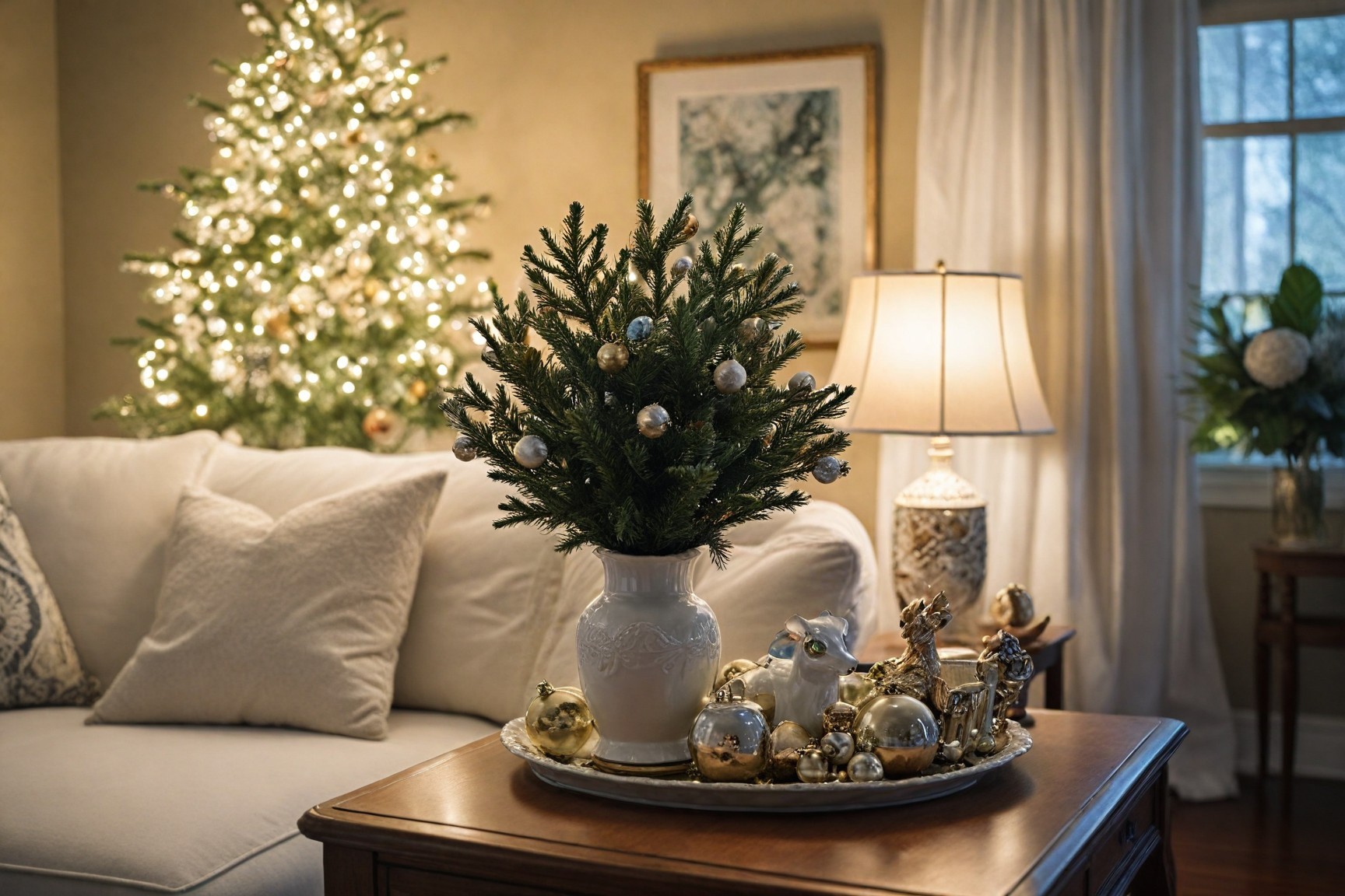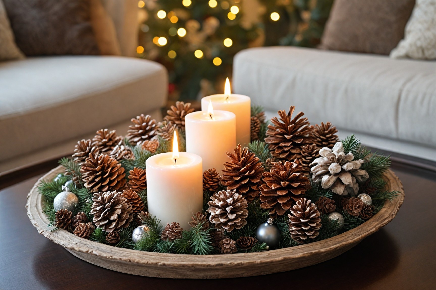 Use a decorative tray on your coffee table to display Christmas ornaments, small candles, or pine cones. This creates a festive focal point while keeping everything neat and organized.