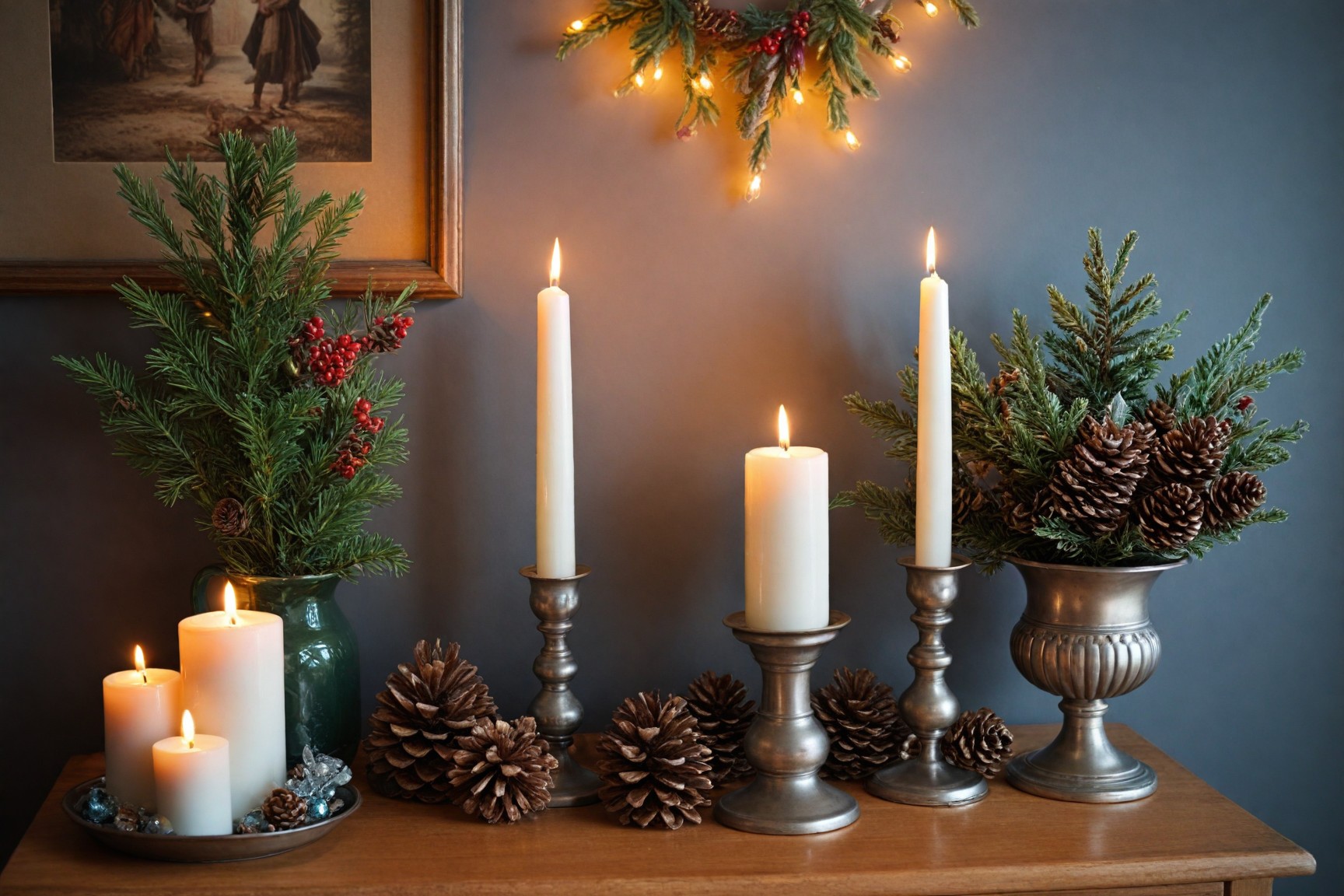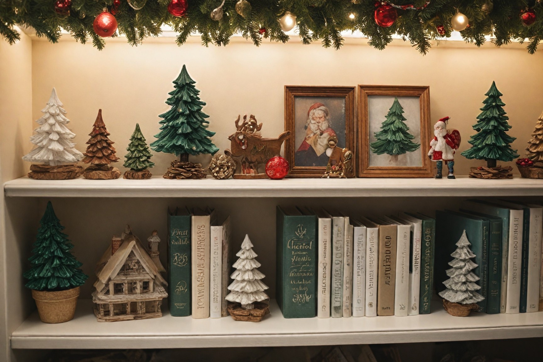 Utilize shelves and wall-mounted decorations for displaying Christmas-themed items like candles, small figurines, or holiday cards.