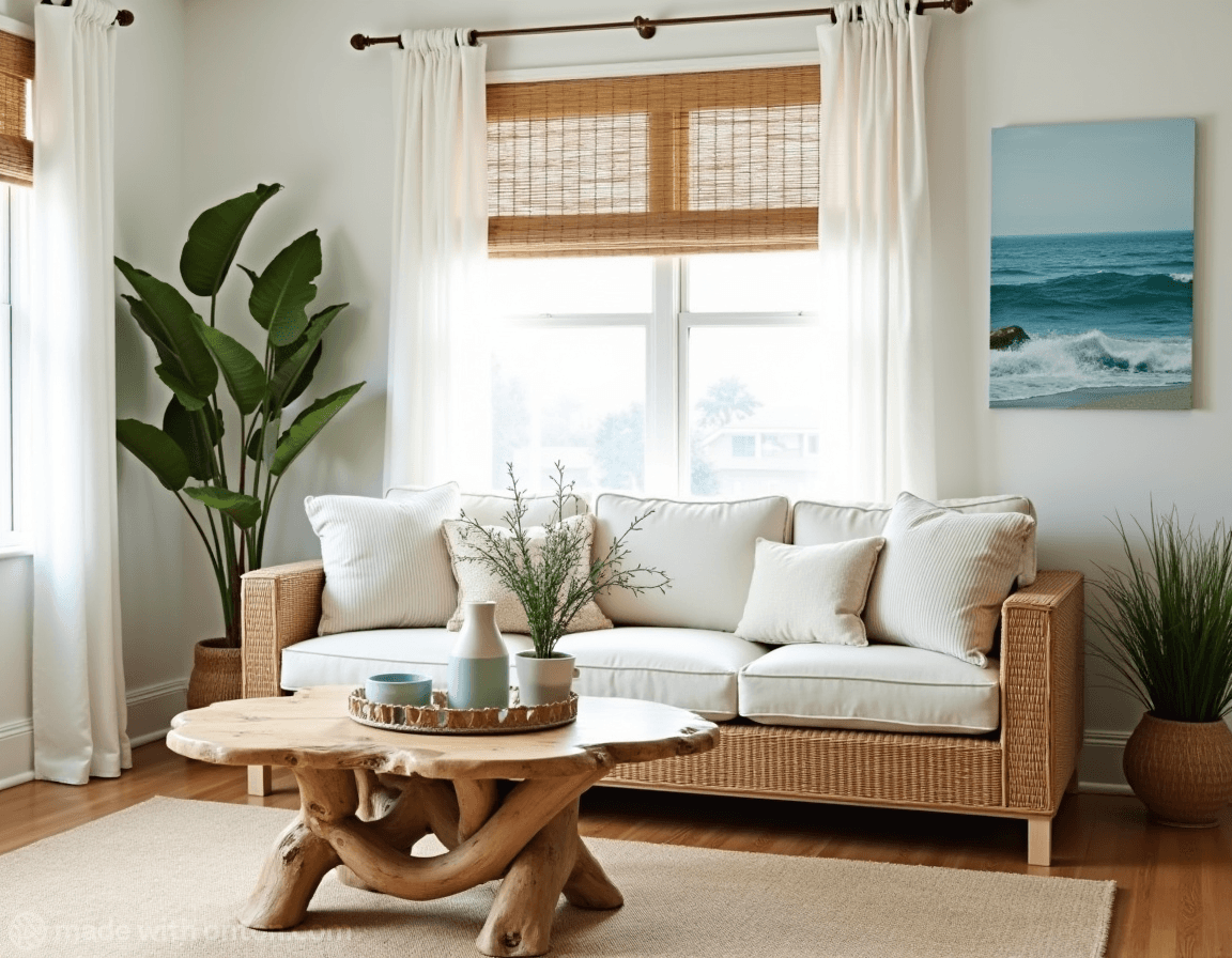 Natural materials such as driftwood, jute, rattan, and seagrass are commonly seen in Coastal style. The materials chosen are free of dyes or stains that may affect their natural color. Woven or textured blinds, linen upholstery, and rattan couches and chairs are also key to creating a seaside aesthetic.
