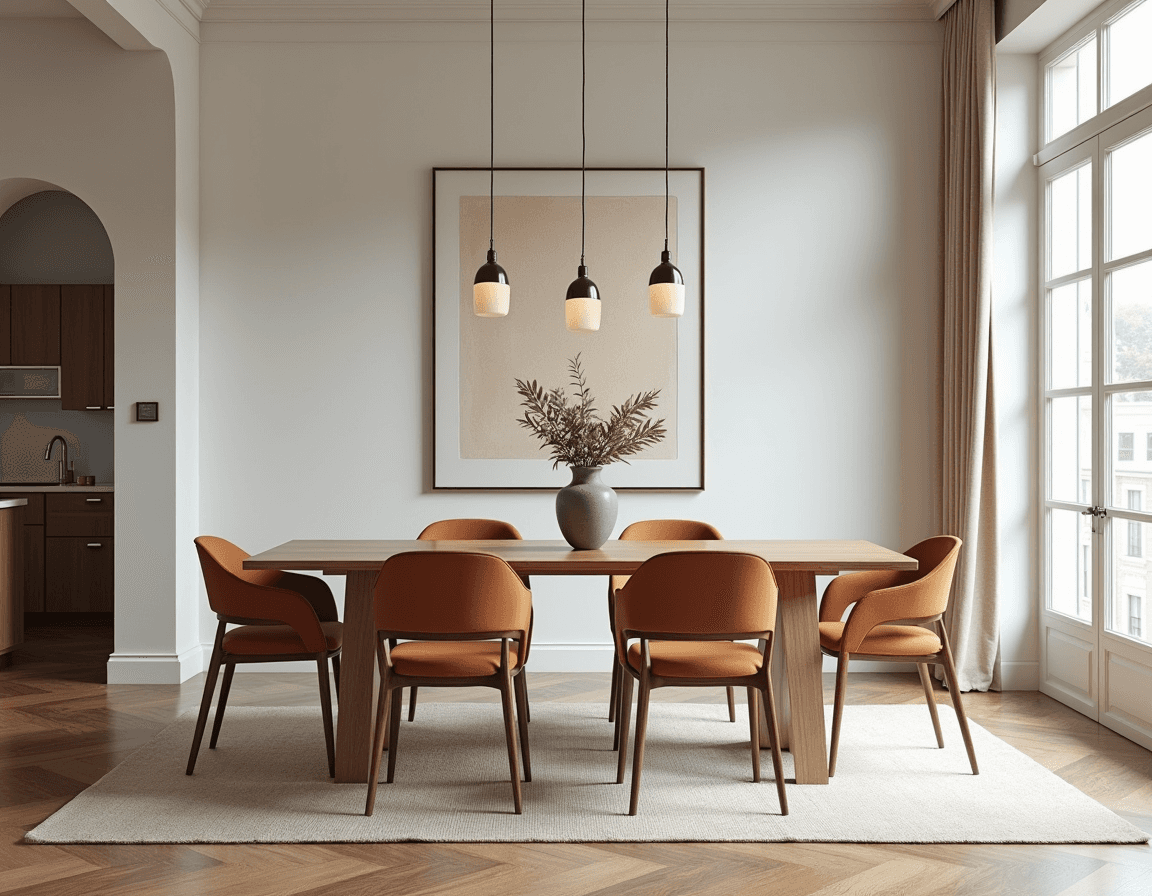 If your table’s width is on the snug side or you want to squeeze in as many seats as possible, armless chairs are the better choice. They’re sleek, often lending themselves to the open feel of minimalist or modern design styles. For a more traditional or bohemian vibe, armchairs really shine — they bring a sense of coziness and craftsmanship that fit those design aesthetics well. Think classic, sturdy frames with detailed woodwork and eye-catching upholstered seats. Just make sure the arm height clears the bottom of your tabletop so everyone can sit comfortably.