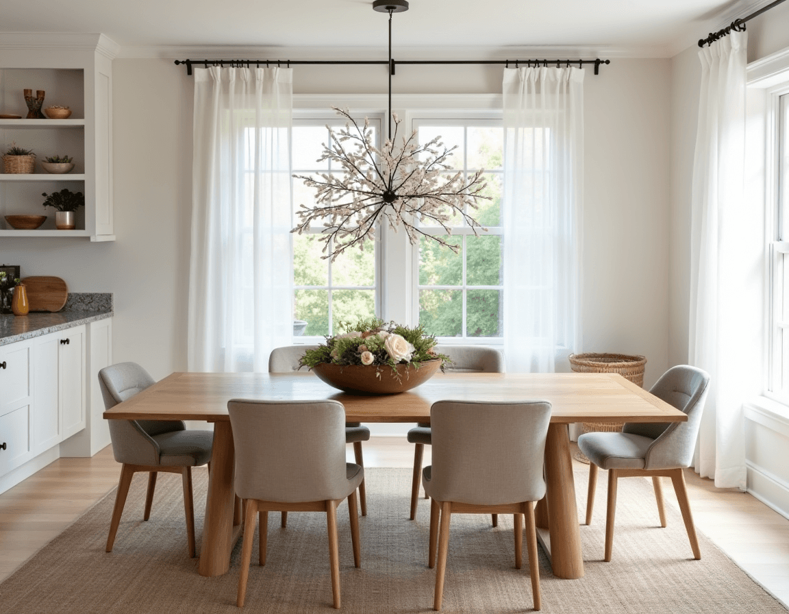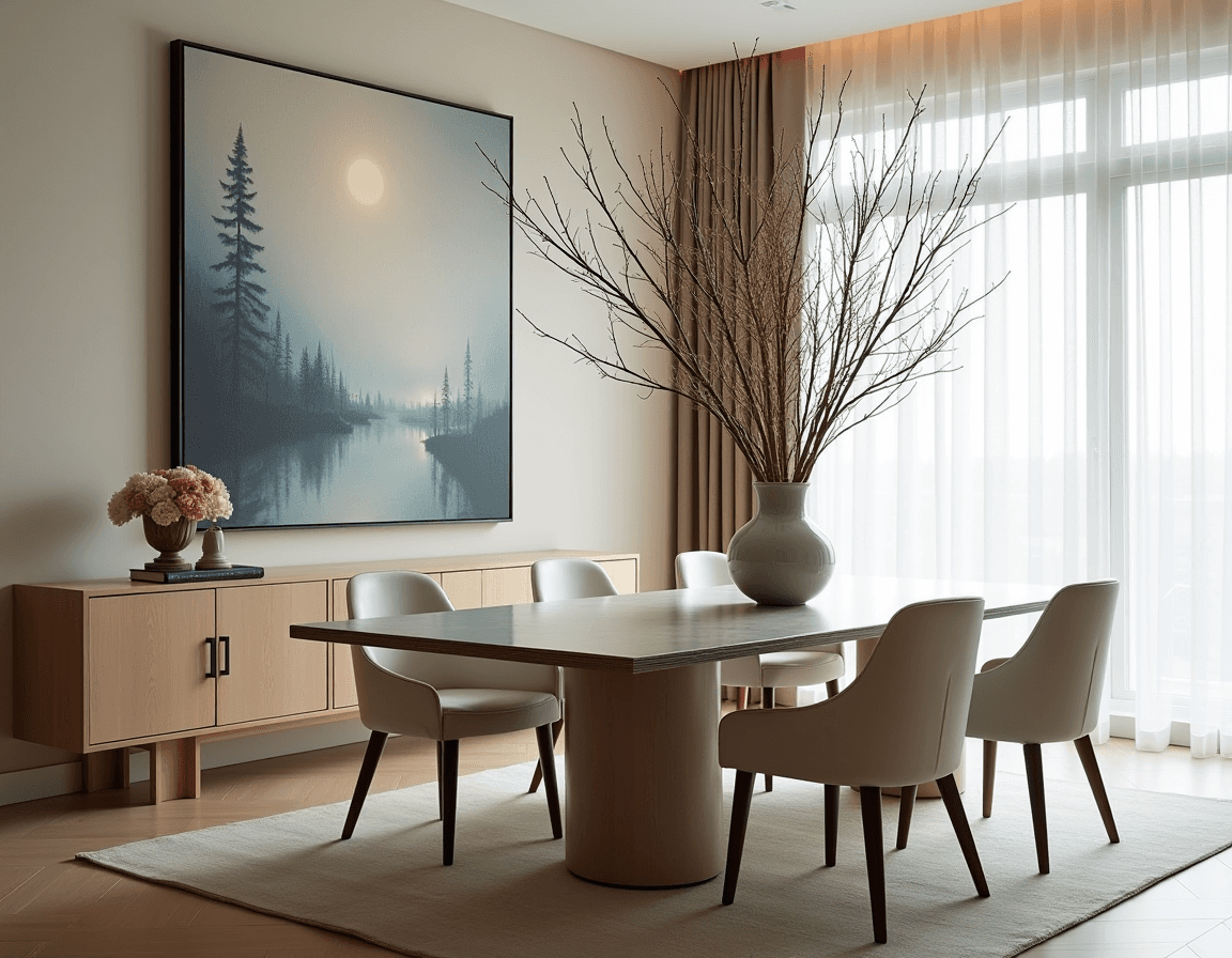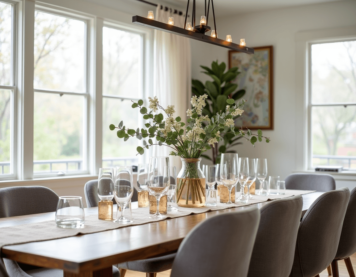 Tall branches in a slim vase adds height and visual layers. It’s dramatic and sculptural, suiting formal minimalist or modern dining rooms well without cluttering your table.