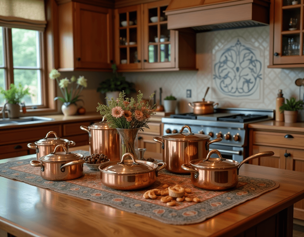 Why hide your prettiest pots when they can double as a standout centerpiece? A polished copper saucepan, soup tureen, or bowl brings instant vintage charm — and especially suits traditional or farmhouse-style dining rooms. Fill it with fresh herbs, seasonal fruit, or flowers, or simply let the aged patina shine on its own.