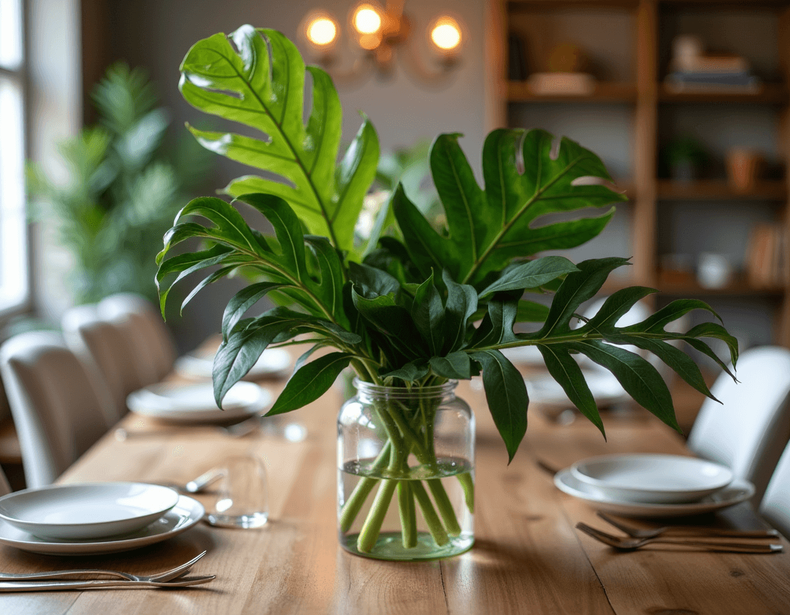 Big, bold tropical leaves like monstera or palm fronds bring a fresh, graphic punch to any table. Use a simple glass or ceramic vase and keep the rest of the decor minimal to let the leaves shine. This is perfect for summer dining or adding a vacation vibe year-round.