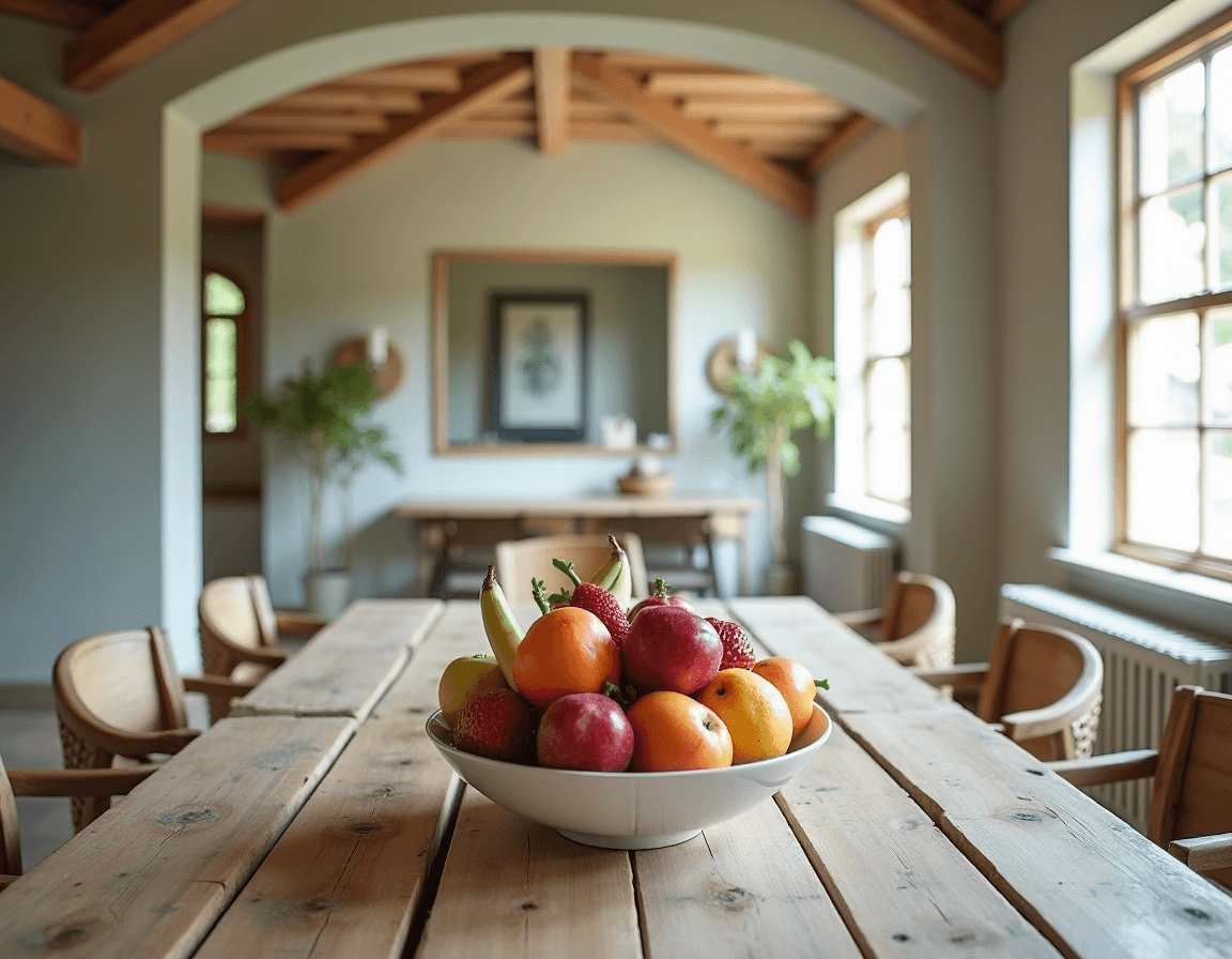 A colorful bowl of fruit is a fresh dining table centerpiece idea for everyday use. It adds natural texture and vibrancy while being practical and easy to update with the seasons — think crisp apples in fall, warm citrus in the spring, and tropical fruit in summer.