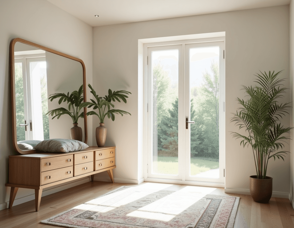 If your entryway is flush with natural light, use it to your advantage. Skip heavy curtains and keep window treatments minimal to let sunshine pour in. Decorate with reflective accents — a large mirror, a glass vase, or even glossy paint — to bounce light around and make small rooms feel bigger.