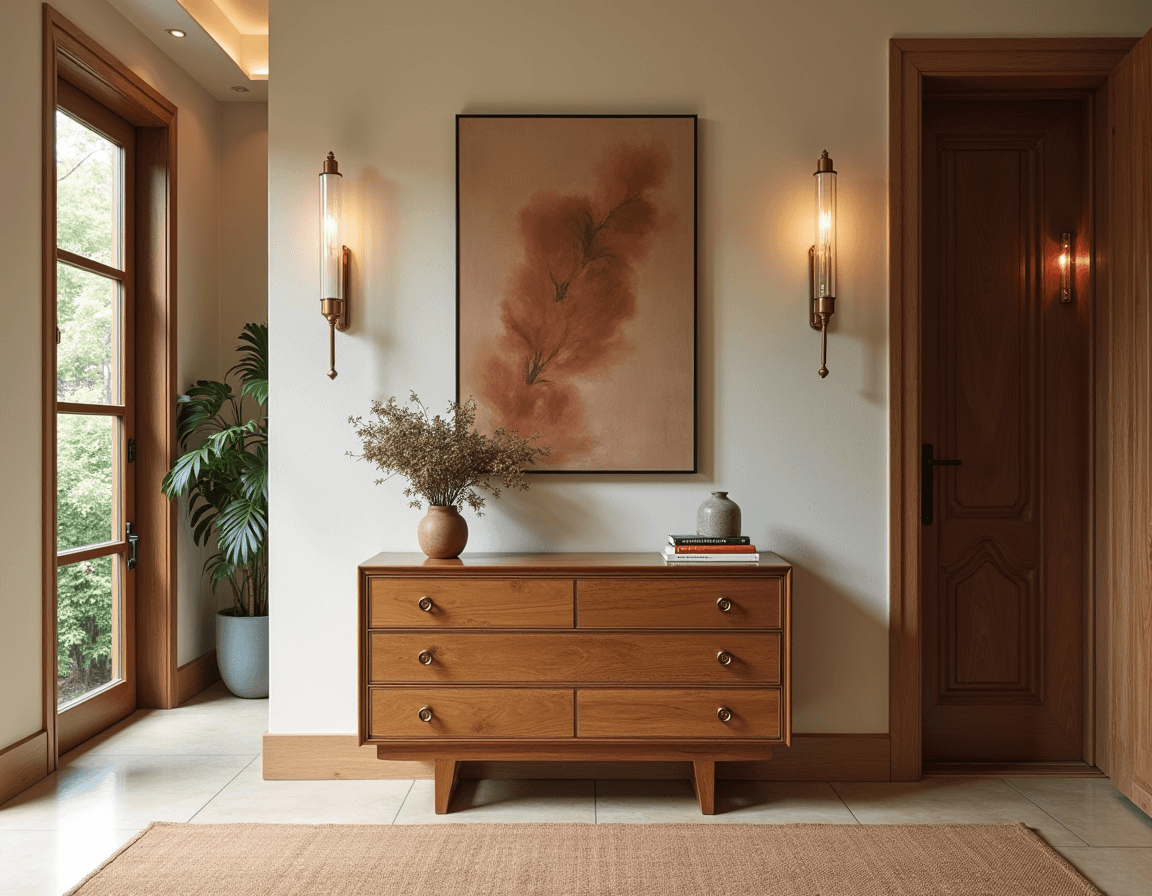 Pick a console table that matches your home’s style (like a sculptural furniture design for a contemporary home or rustic reclaimed wood for a farmhouse vibe) to create a seamless transition from the front door to your living space.