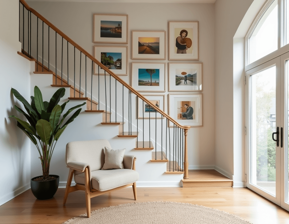 Staircases have a natural sense of movement, providing more depth for dynamic gallery wall layouts. Varied shapes and sizes move the eye upward, while matching wood picture frames and color palettes keep the vibe cohesive. For a more polished look, put artwork evenly along the stair rail and keep the spacing steady all the way up.