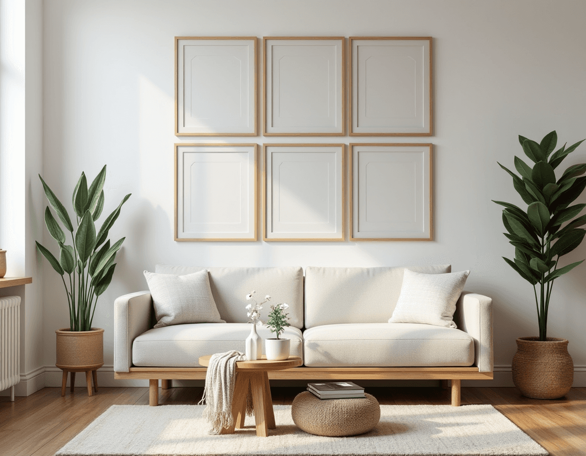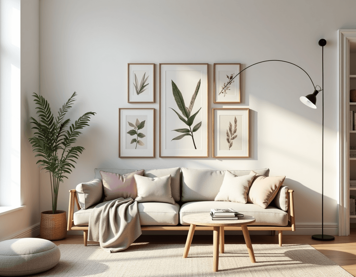Mirror the vibe you establish in a themed gallery wall with other decor choices, like a beige couch, pink throw pillows, and woven rattan plant pot to match a calming, contemporary gallery wall.