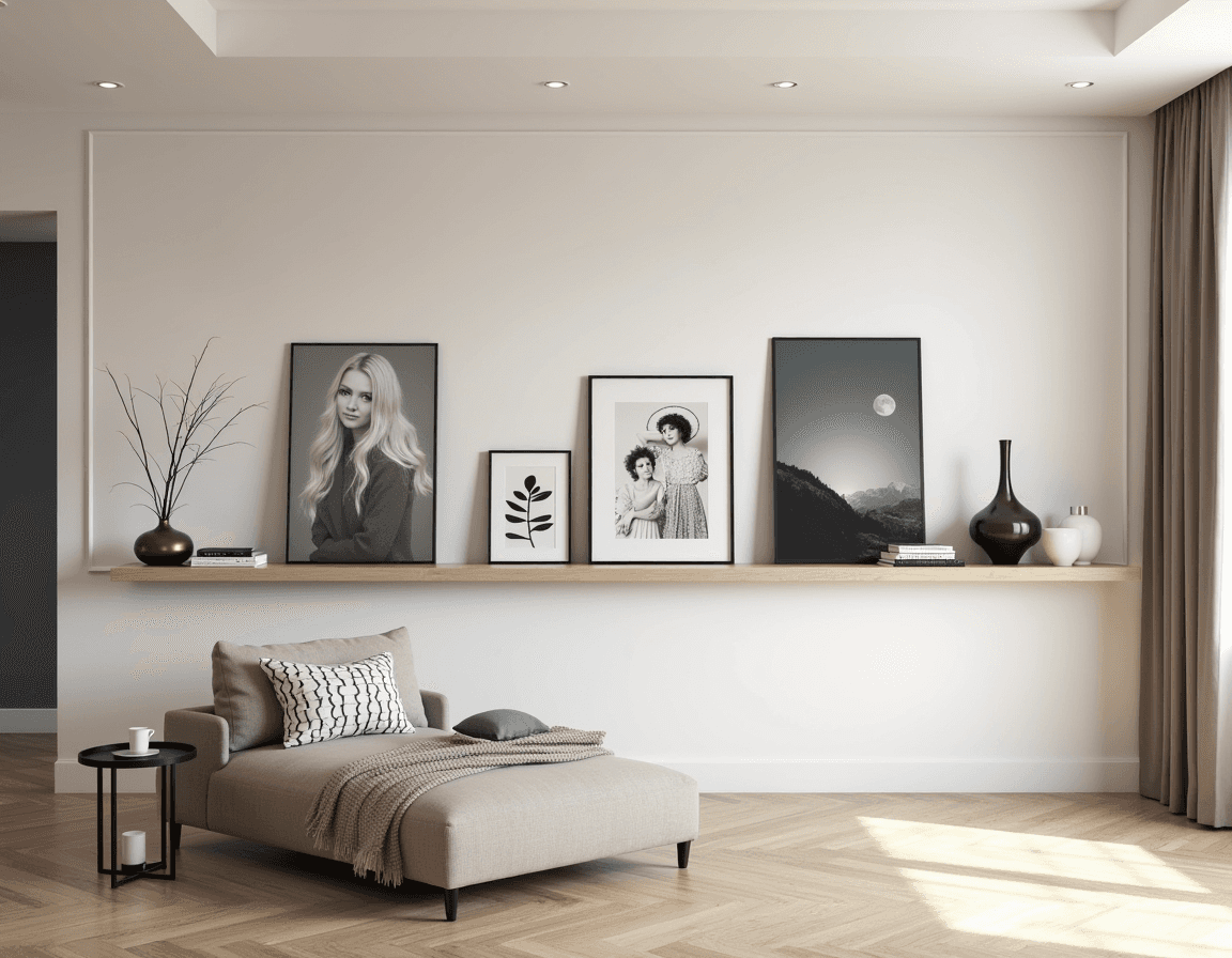 A picture ledge is a low-commitment gallery wall idea. Everything rests on the same plane, which creates a more calm, balanced look than most gallery walls, even if the frames vary in size or style. The ledge doubles as a shelf, giving you extra space to play around with decorative decor like a sculptural vase, a cluster of candle holders, or a small ceramic bust. Plus, you can swap pieces in and out whenever the mood strikes, or you find a piece of art you just can’t pass by.