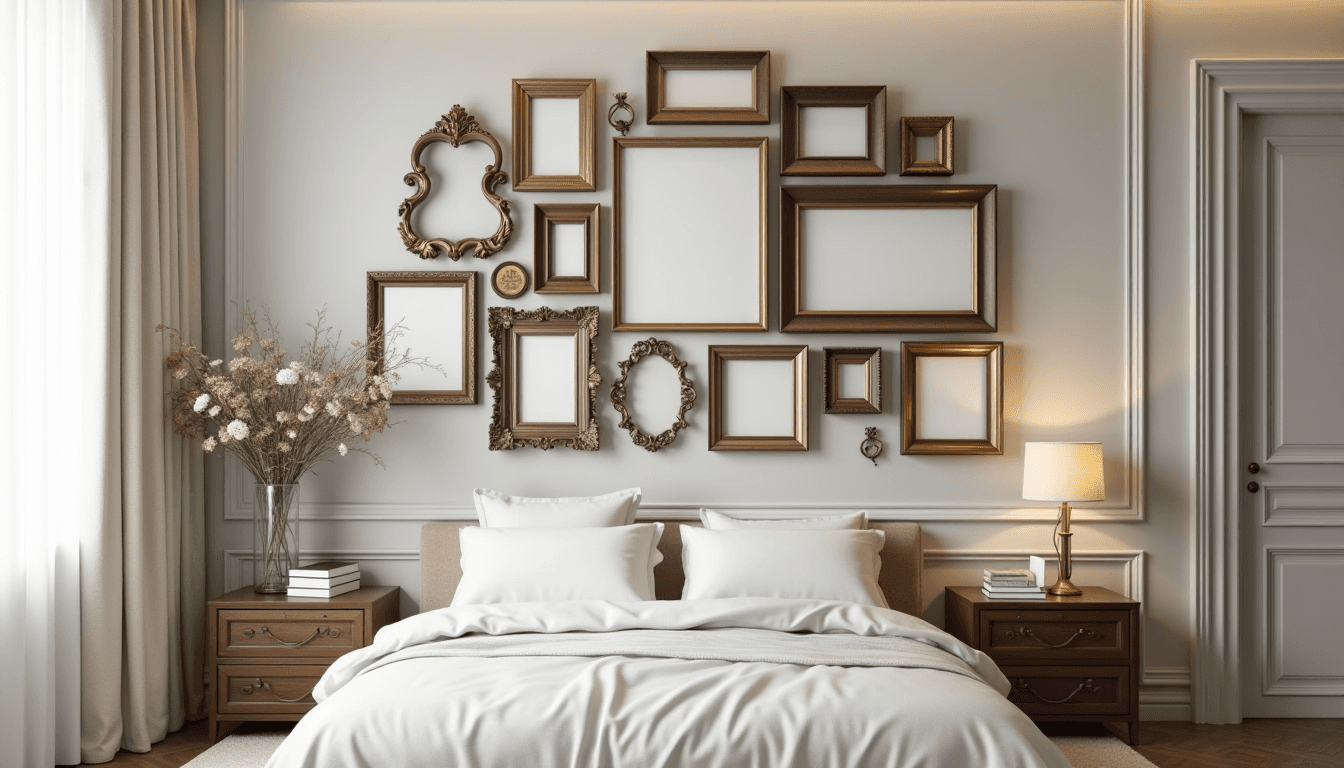 Who needs wall art when you have a dozen ornate frames to show off? Layered edges and flourishes turn negative space into the art itself. It’s a clever bedroom wall idea for eclectic, bohemian, and vintage-inspired spaces — especially those with a lot of color already present or a particularly restricted palette. Use a mix of frame shapes and finishes with similar tones so the gallery feels like it’s been collected from swap meets and antique shops over time.
