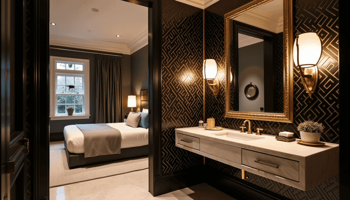 An Art Deco guest bathroom combines elegance and modern aesthetics. You can achieve this look with distinct geometric patterns and luxurious materials.