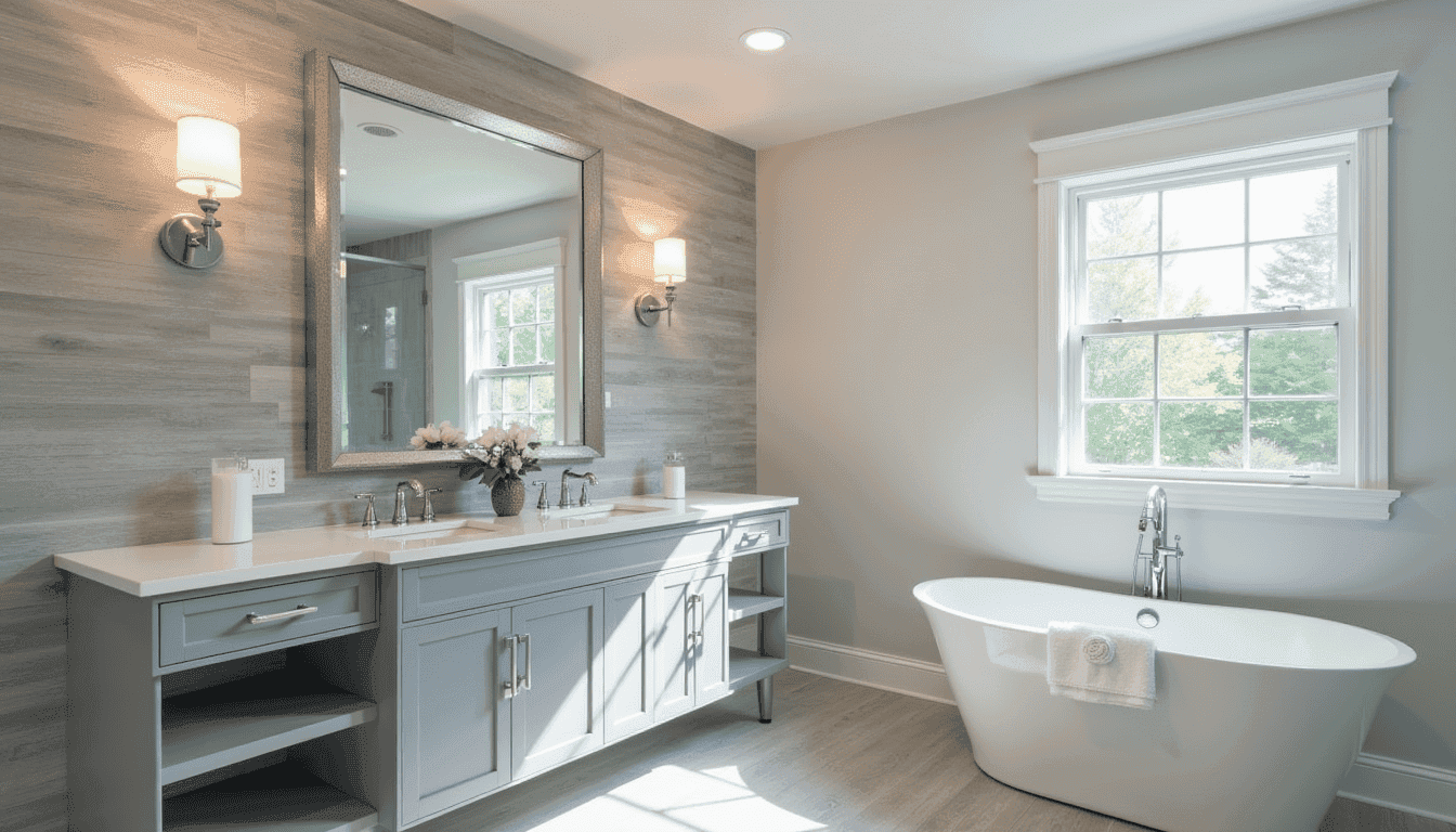 To add warmth to the gray tones, consider incorporating metallic accents. Fixtures in brushed nickel or matte black will enhance the modern design. A statement mirror with a metallic frame can also serve as a focal point.