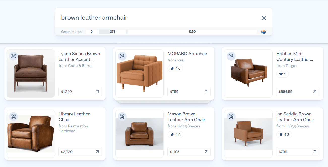 Suppose you just created the ideal layout for your home, but the items are just too expensive. With AI interior design tools, you no longer have to choose between your dream design and your budget. For example, you can reverse image search your desired furniture to find different dupe options and low-cost white-label furniture pieces that deliver the same style for a fraction of the price. If you need more specific brand suggestions within your budget, you can ask an AI virtual assistant for personalized assistance.