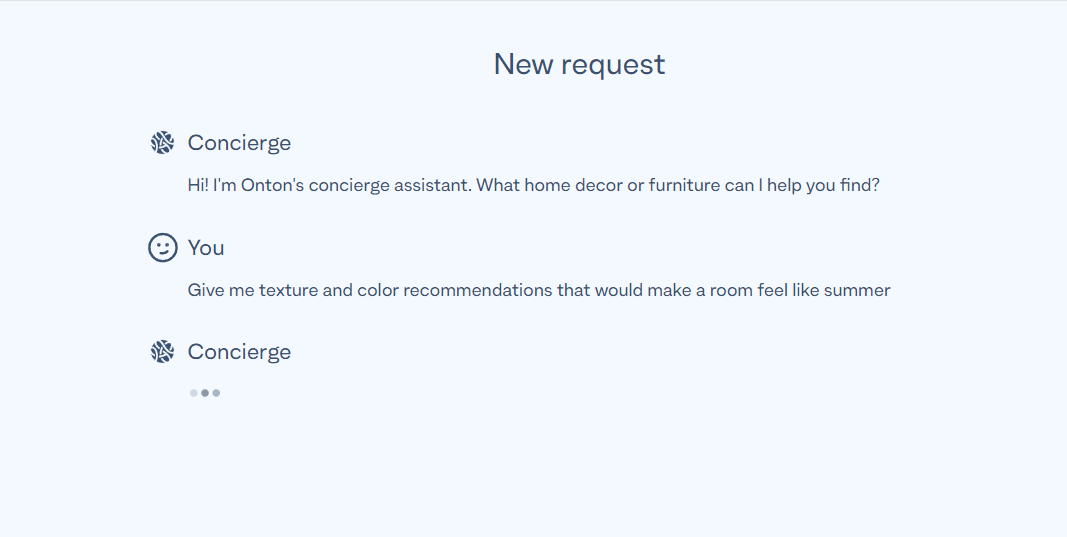 Looking for some expert-level advice? Use Onton Concierge, our AI-powered virtual assistant, to get personalized design assistance and hone in on your vision. Onton Concierge is also available directly within Onton Search to make your design journey as efficient as possible.