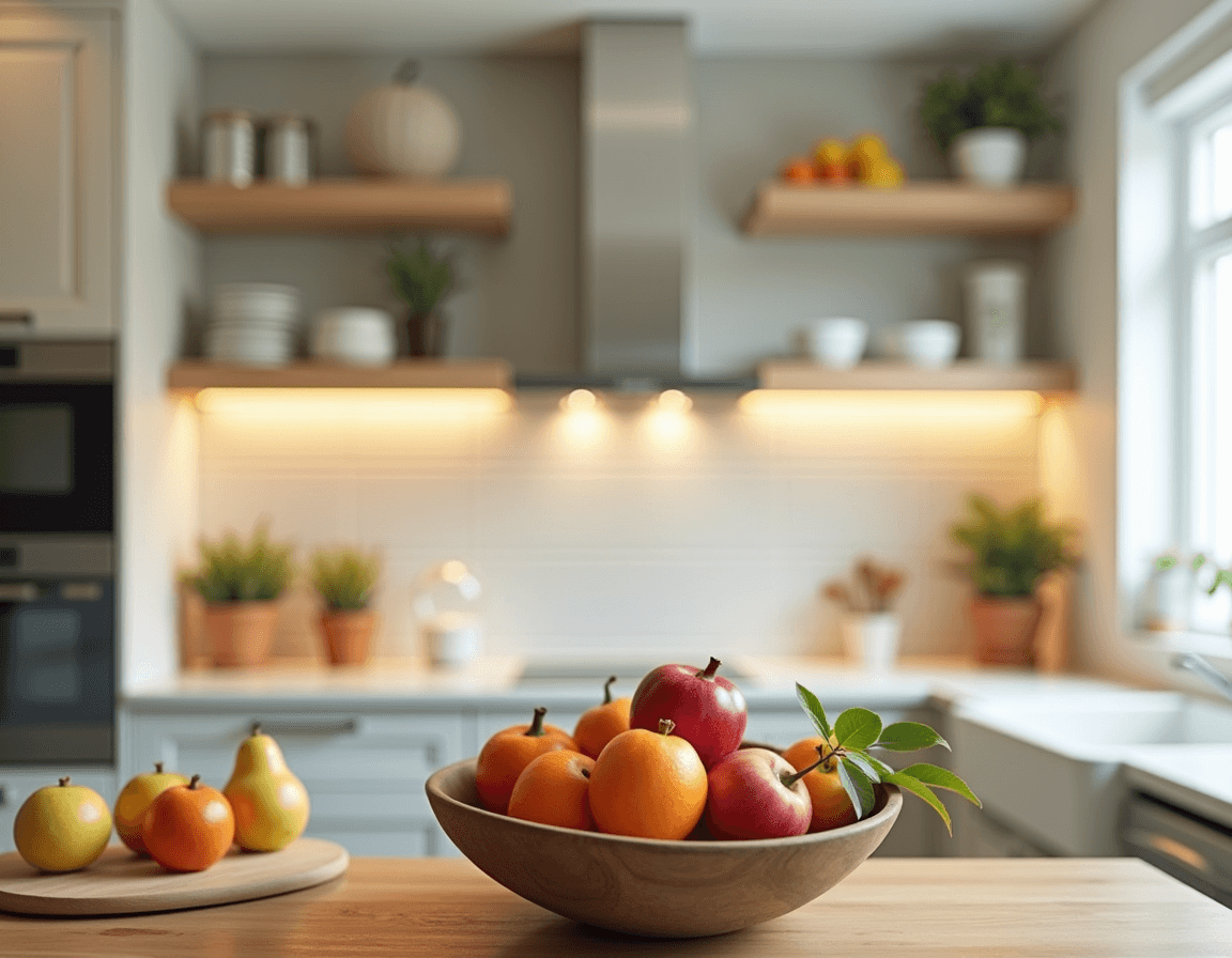 A small lamp softens the vibe and adds a cozy glow for evening meal prep or late-night snacks — an easy way to warm things up alongside your overhead kitchen lighting.
