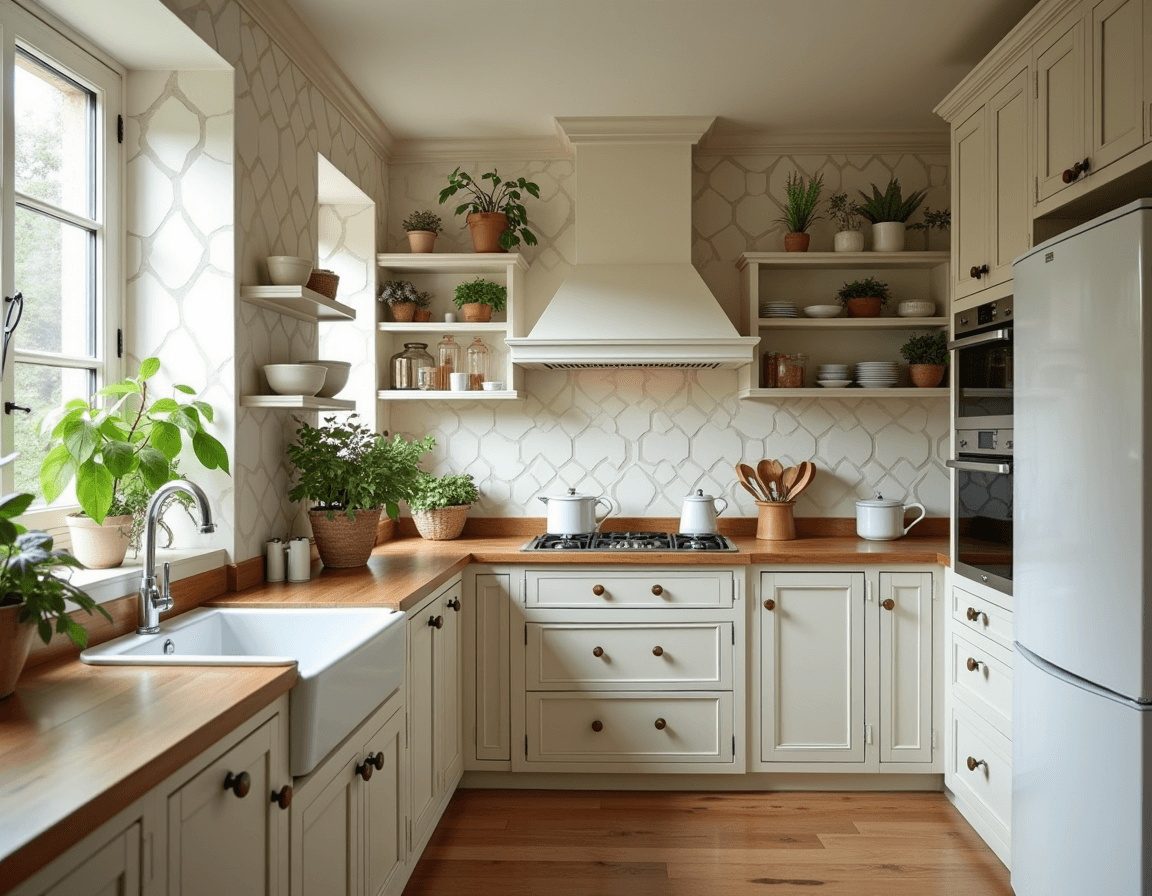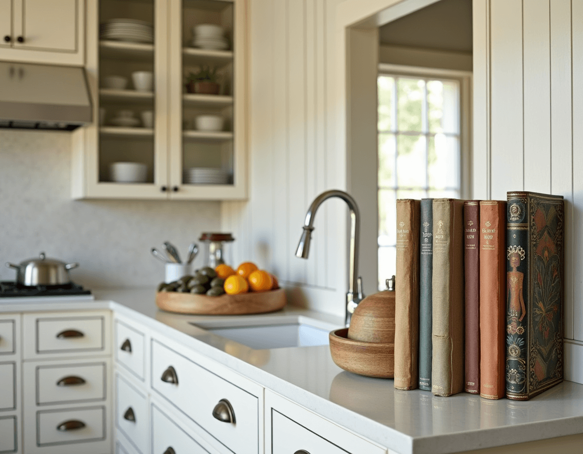 Play with levels: Stack books, elevate planters, or lean cutting boards to create height variation across your kitchen countertops.
