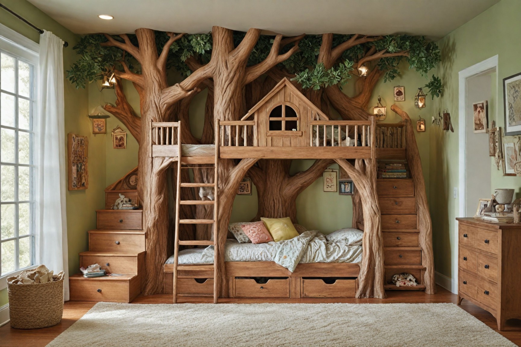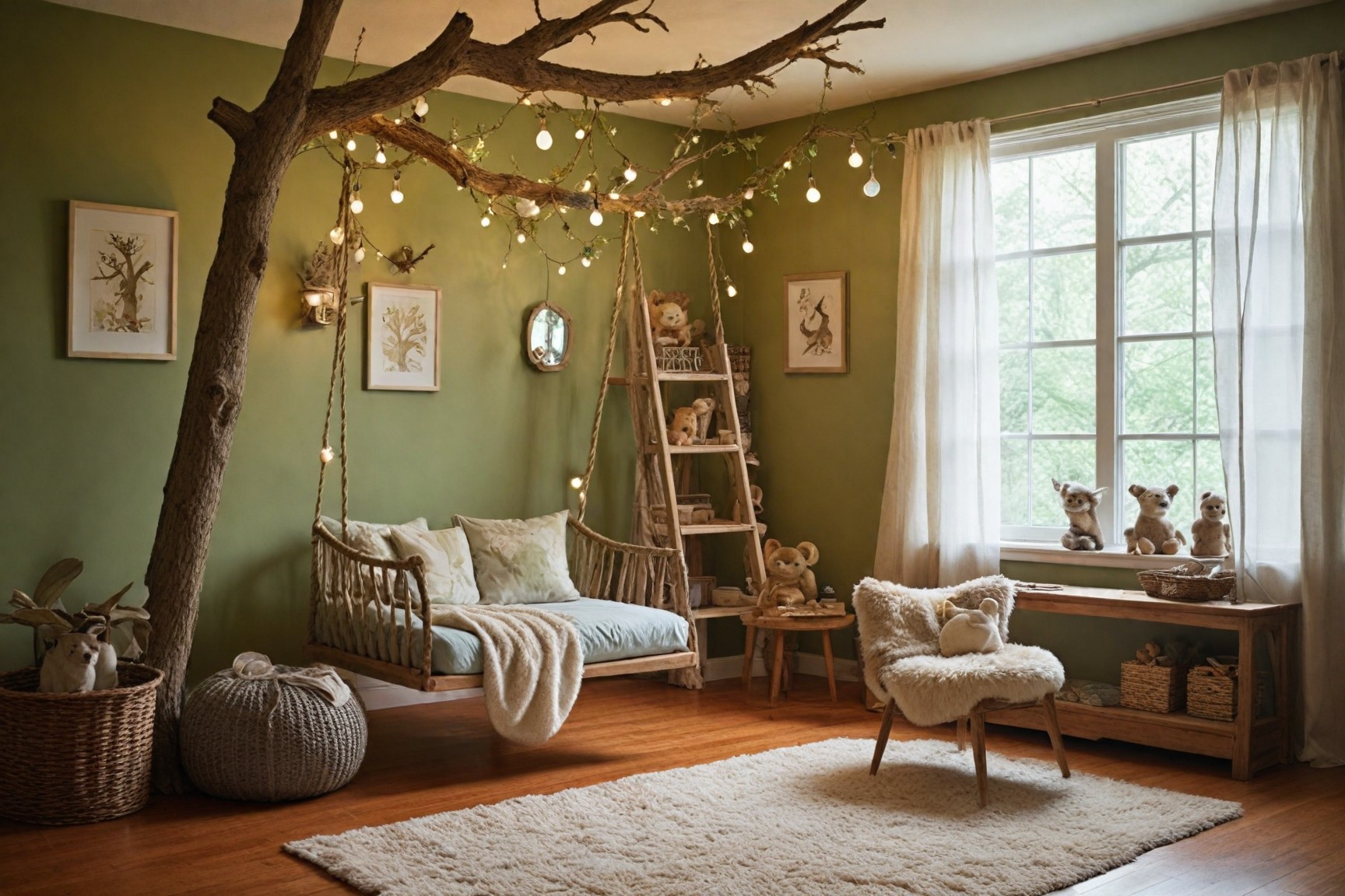 Add charming details like birdhouses and wooden signs to enhance the theme. Use soft, earthy colors to maintain a soothing and warm atmosphere. Implement creative storage solutions, such as hidden drawers in "tree trunks" or shelves built into a tree design, to keep the room functional and clutter-free.