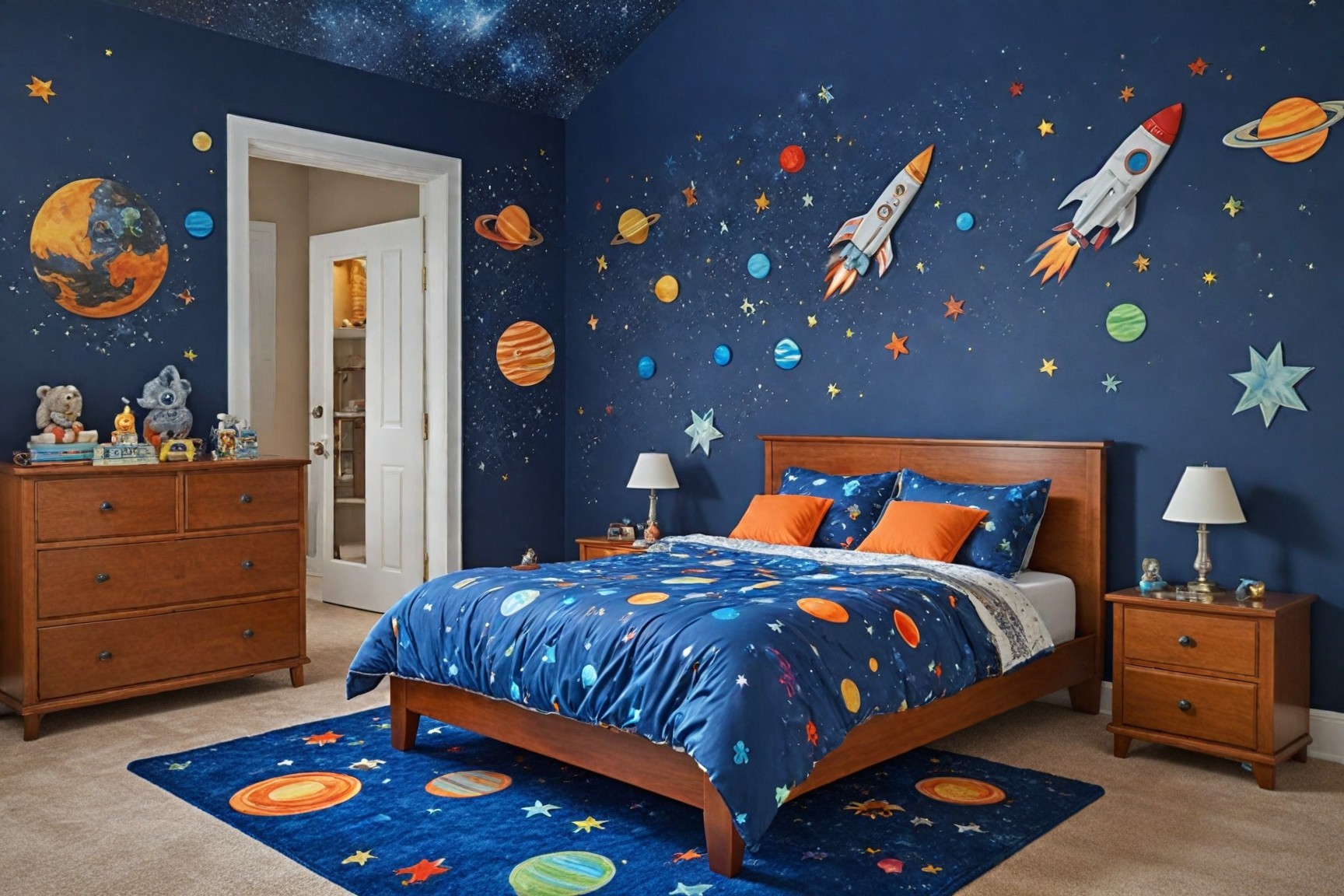 Incorporate a rocket ship bed or create a space station play area to enhance the theme. Accessories like telescopes for stargazing and educational posters about the solar system can make the room both fun and educational. Add space-themed bedding and a galaxy-inspired rug to complete the look.