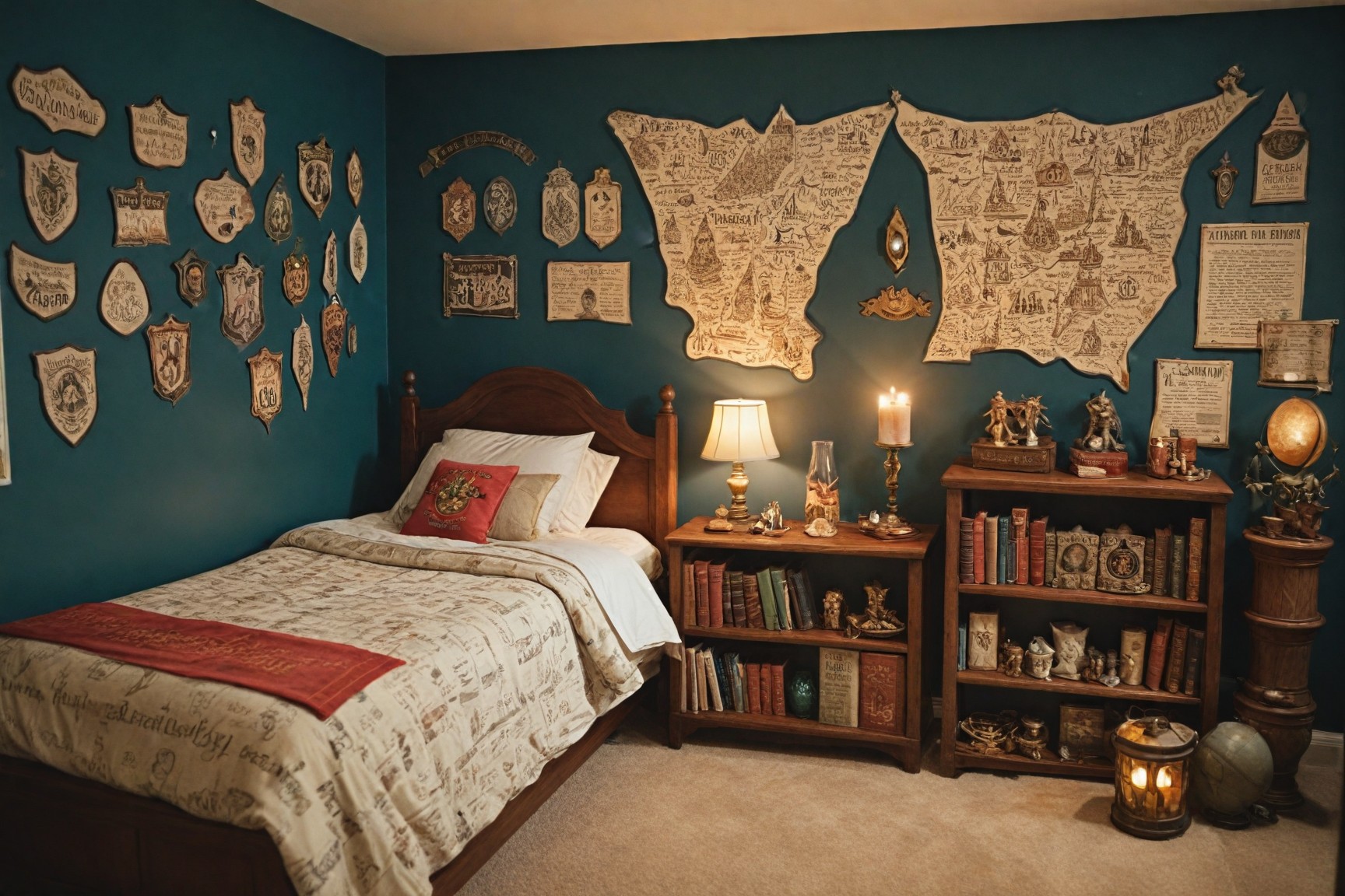 Incorporate iconic symbols such as the Hogwarts houses, the Marauder's Map, and potion bottles as unique storage solutions and decorative items. Add details like wall decals of famous quotes, Hogwarts banners, and floating candles to enhance the magical atmosphere. This themed room will delight any young wizard or witch.