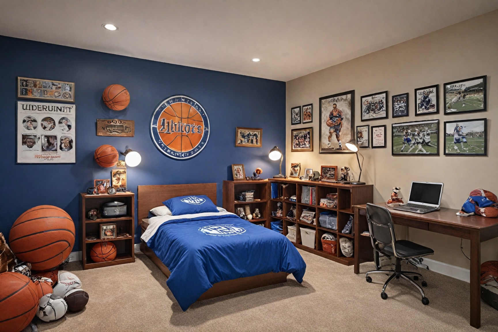 Choose bedding that features team logos or colors to unify the theme. Add fun elements like a mini basketball hoop, a soccer goal, or a baseball mitt wall decor. Balance the decor with functionality, ensuring ample space for play and storage. Use modular furniture that can easily adapt as interests evolve.