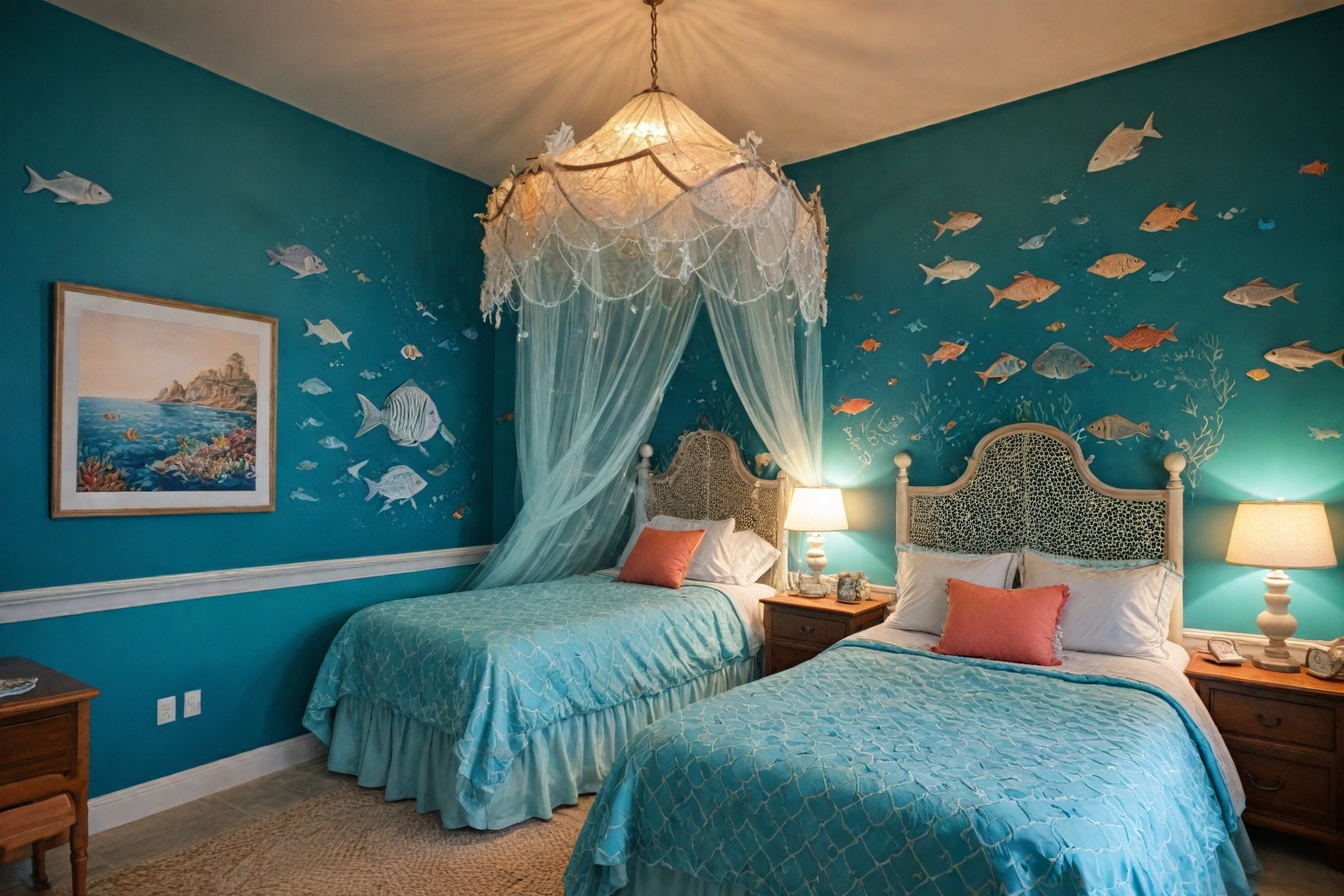 Enhance the theme with a fish net canopy over the bed, giving the feel of a cozy underwater hideaway. Ocean-themed lighting fixtures that project waves or fish on the ceiling can add a dynamic touch. Educational elements, such as wall art labeling different sea creatures and interactive maps of the ocean floor, can spark curiosity and learning. Consider adding a soft, sand-colored carpet to complete the undersea ambiance and provide a comfortable play area.