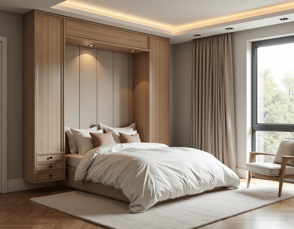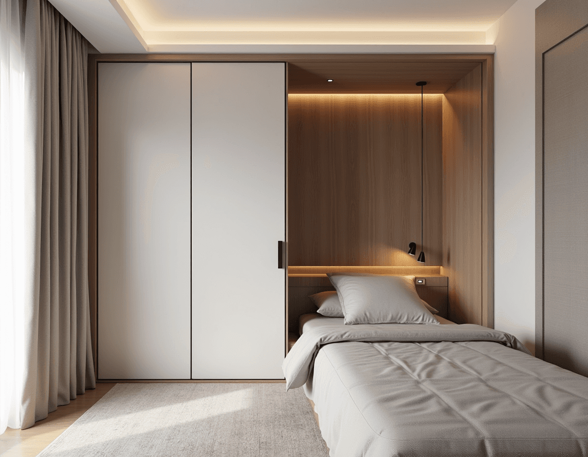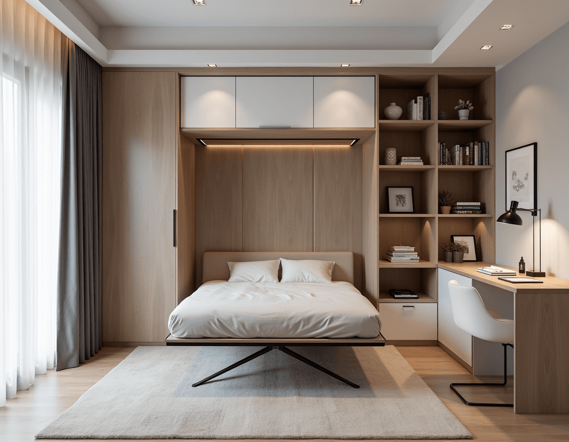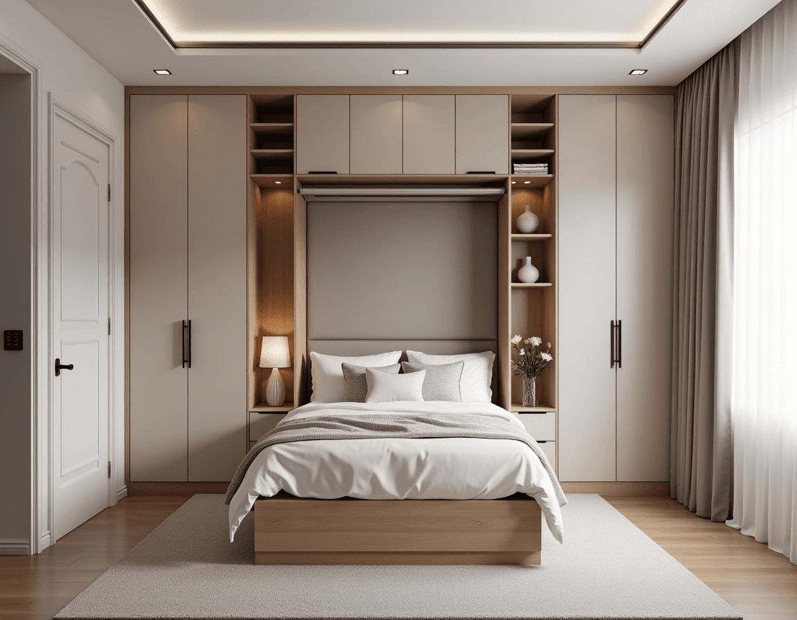 For short walls in small spaces, a Murphy bed that blends into a full-height wardrobe — which functions as real storage — is a smart idea. It reads like a clean wall of cabinetry with the bed tucked away, keeping bulky furniture from overwhelming the layout. Add low-pile rugs, floating shelves, and a wall-mounted mirror to maximize your use of the space.