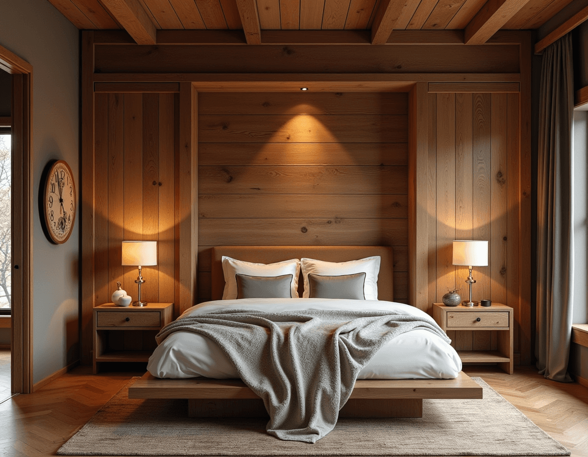 If your home is more like a rustic cottage than a sleek city apartment, a standard paneled Murphy bed could break the rhythm. Embracing natural materials, like floor-to-ceiling paneling and dark wood grain, doesn’t have to mean sacrificing ways to save space. A wood platform bed in the same finish will blend in when folded up, disappearing into the wall like just another panel. Pair it with textured bedding and warm strip lighting (or inset overhead lights) to keep the room cozy.