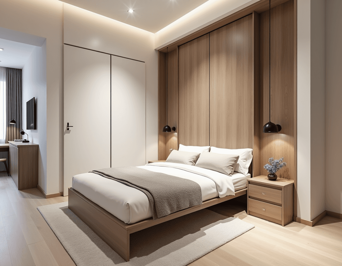 Whatever ideas you might have for your temporary sleeping place, your Murphy bed should fit with the rest of your interior design. Murphy beds in soft neutral colors with little-to-no decorative twists on a panel are flexible enough to match most styles. A clean-lined platform bed fits perfectly with a minimalist, Japandi, or Nordic aesthetic, especially when paired with a simple area rug and matte black pendant lamps.