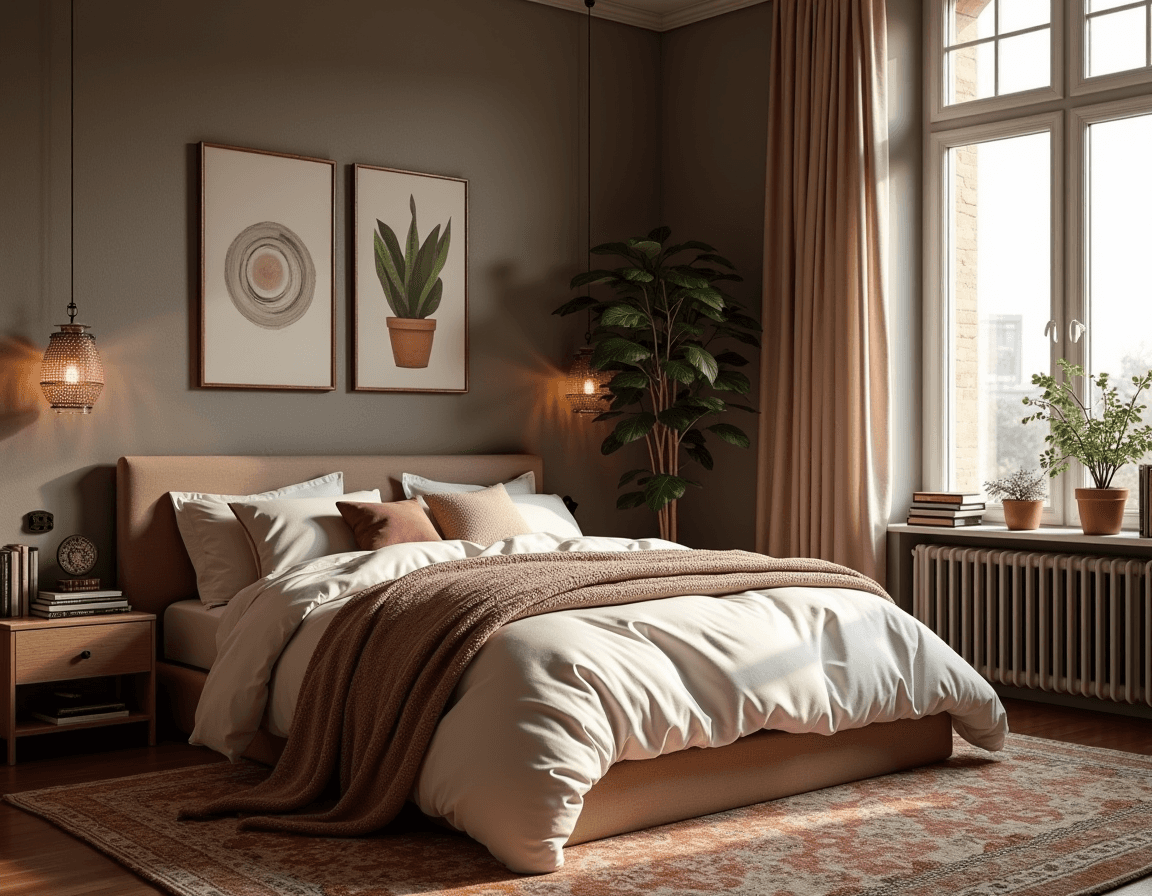 Bohemian bedrooms embrace eclectic maximalism. Layer your bedside table with patterns, materials, and personal objects to fill the space. Think dried pampas grass spilling from a vintage vase, a woven rattan basket, a raffia table lamp, and a colorful ceramic candle holder that adds an unexpected pop.