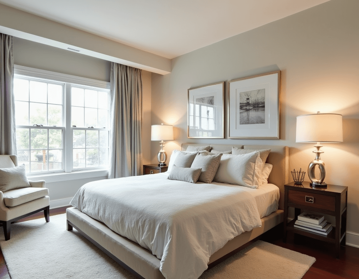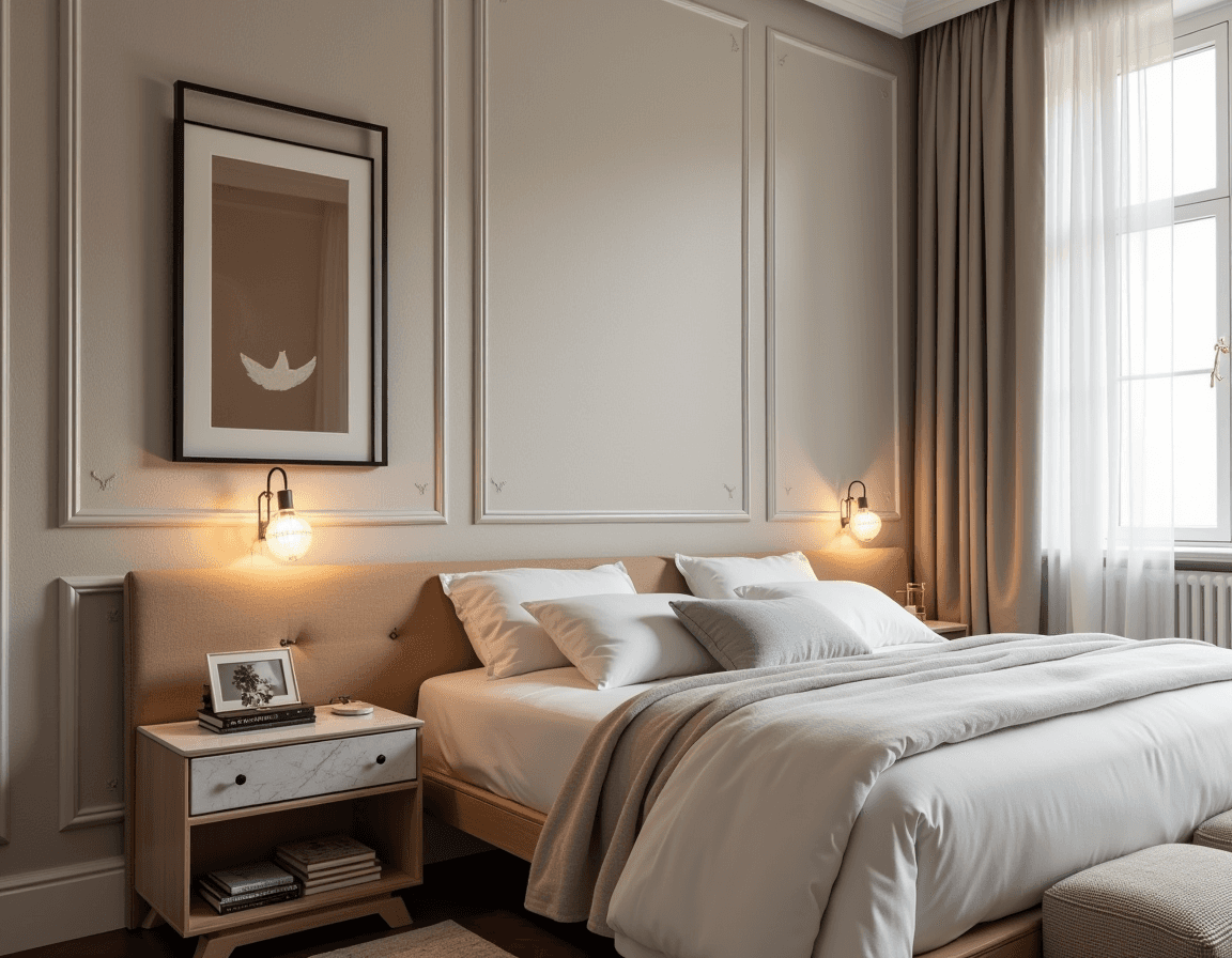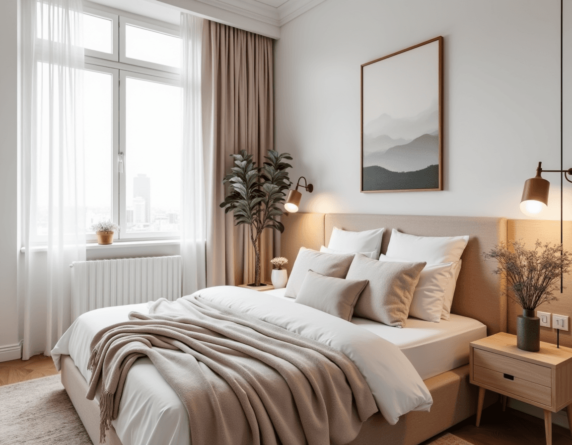 Minimalism keeps things simple and sleek. Think smooth surfaces, neutral colors, and a few well-chosen items that embrace good feng shui energy. A slim lamp with a neutral-toned shade, a single succulent in a white ceramic pot, or a mid-century modern alarm clock keep the look calm. Prioritize plenty of breathing room — nothing should feel cluttered or crowded.