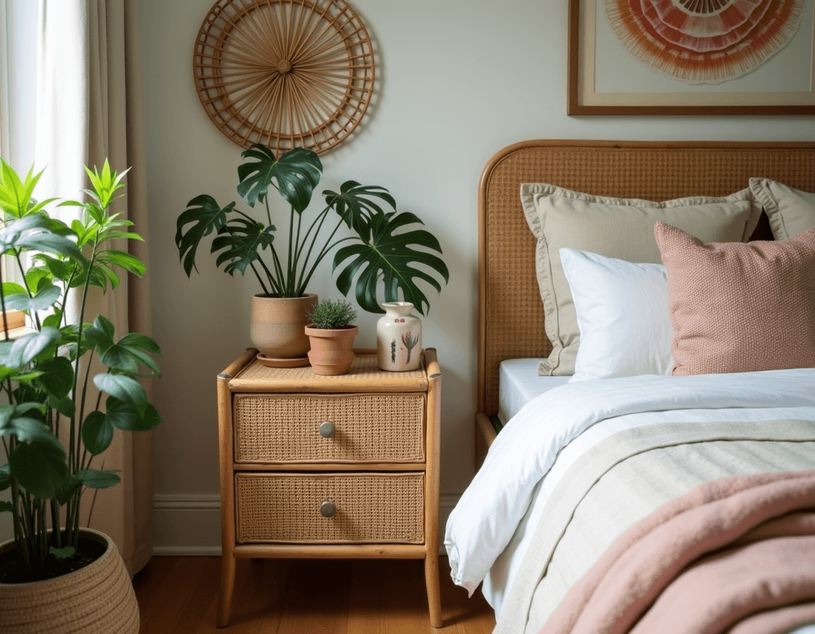 Boho night table with rattan textures and plants
