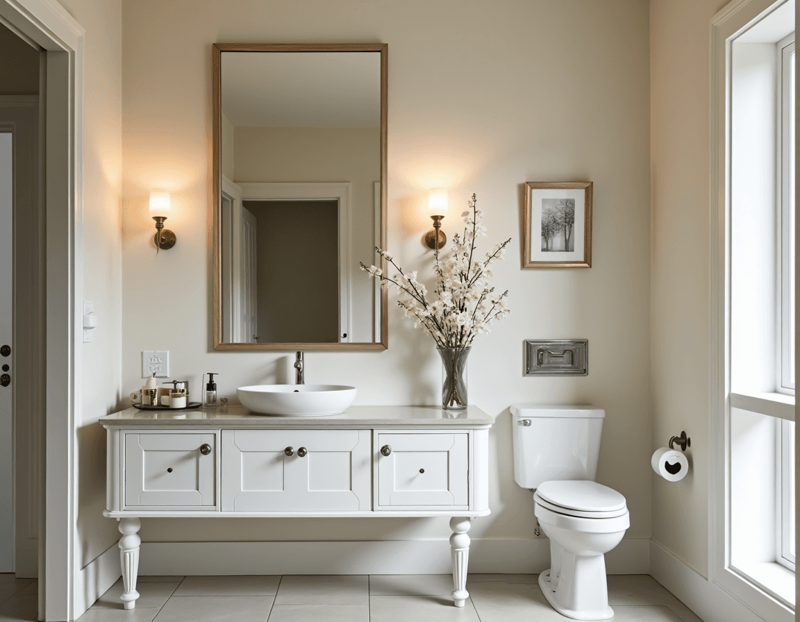 When floor space is tight, a wall-mounted shelf is a smart solution to house essentials and decorative items like towels, makeup cases, and small plants. Floating wood shelves will add warm zen vibes, while metal brackets give an industrial touch, turning blank walls into practical spaces for your powder room decor.