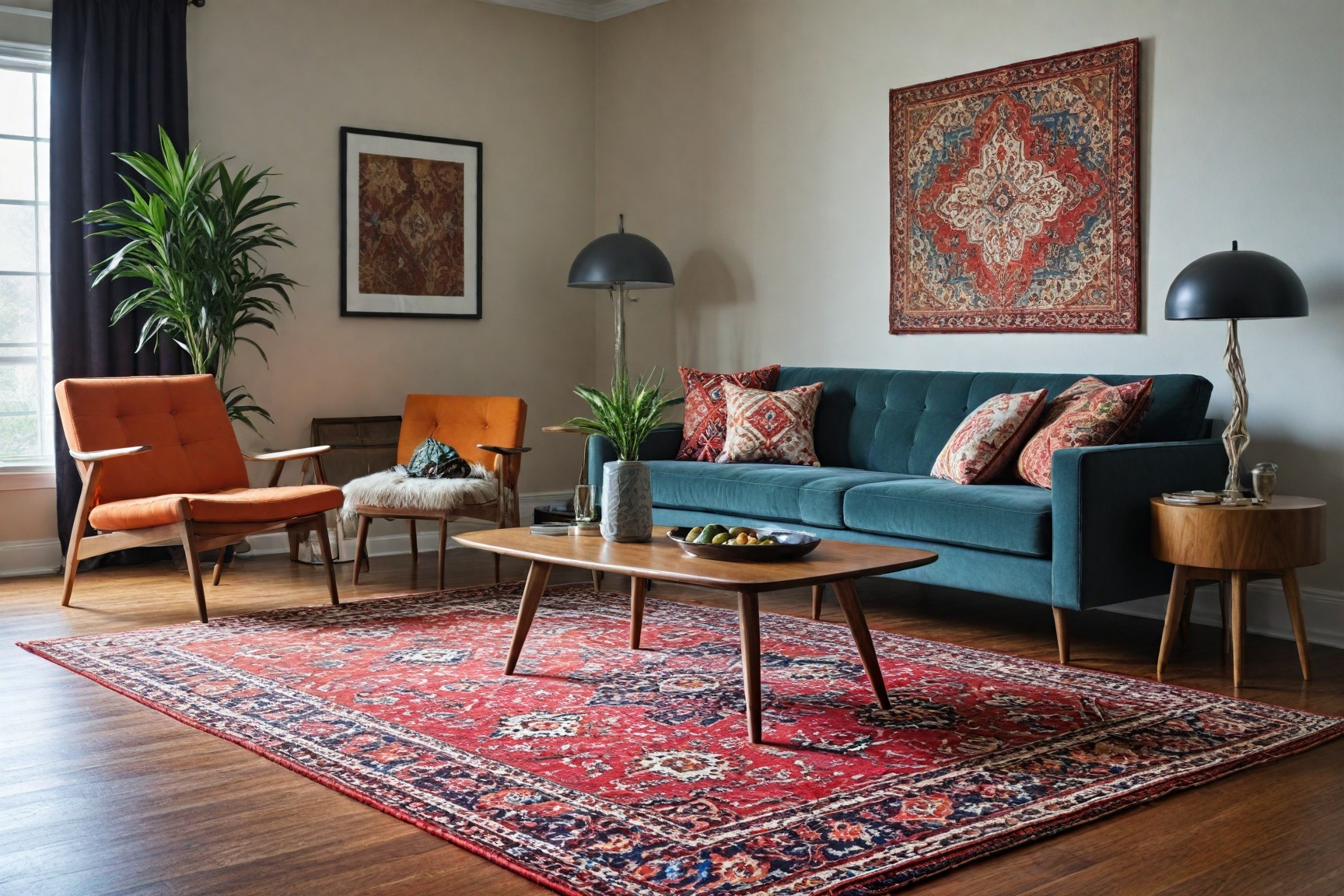 Your rug should complement your living room’s design. Neutral tones and minimalist patterns can balance bold furniture, while vibrant rugs add character and become focal points. Consider current trends like geometric designs, traditional motifs, or understated elegance to fit your decor.
