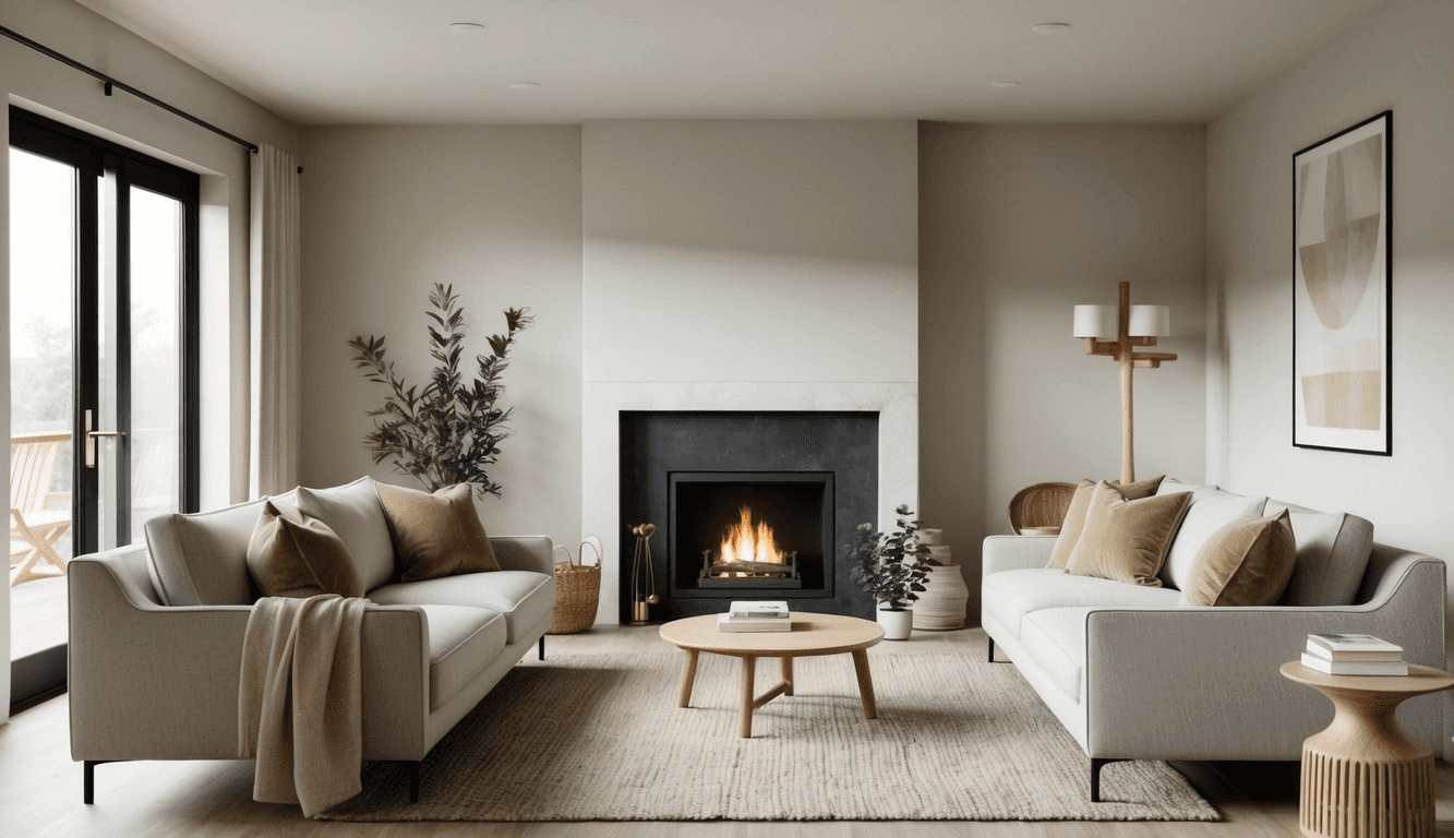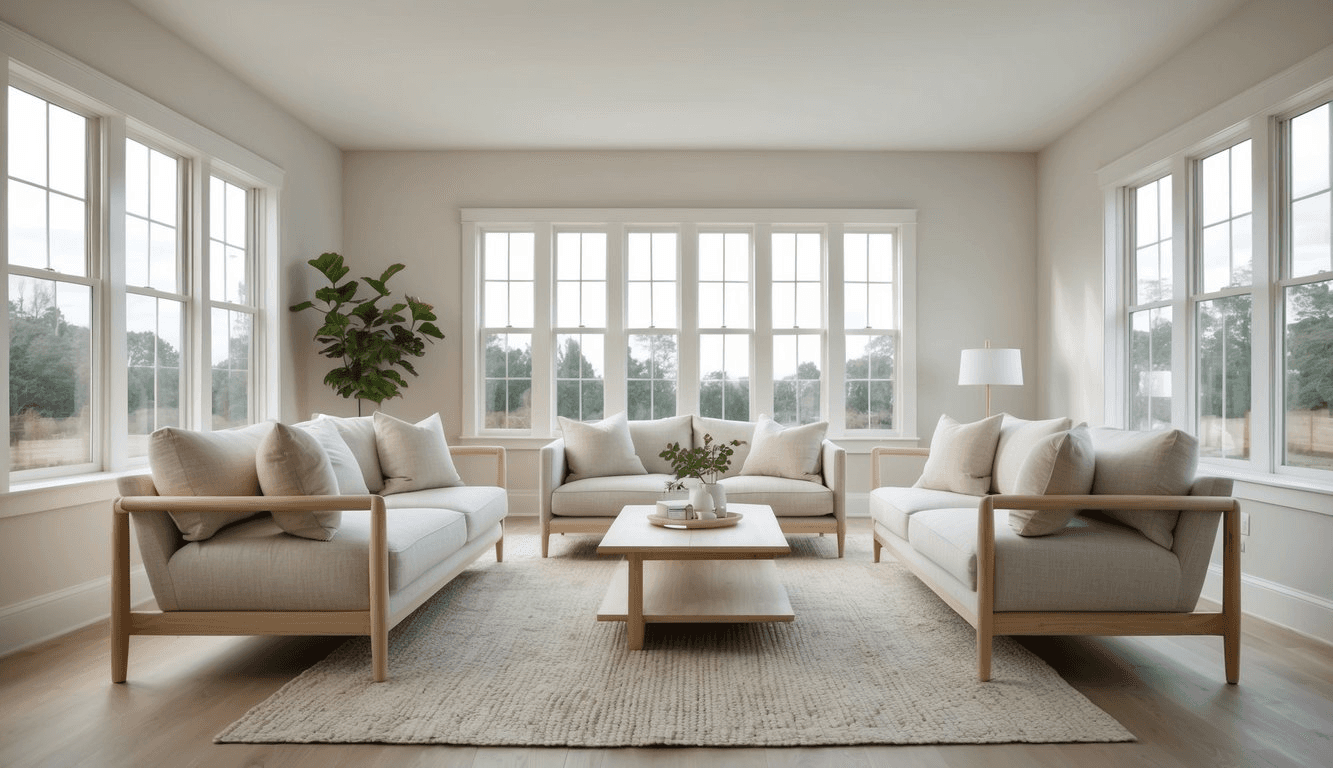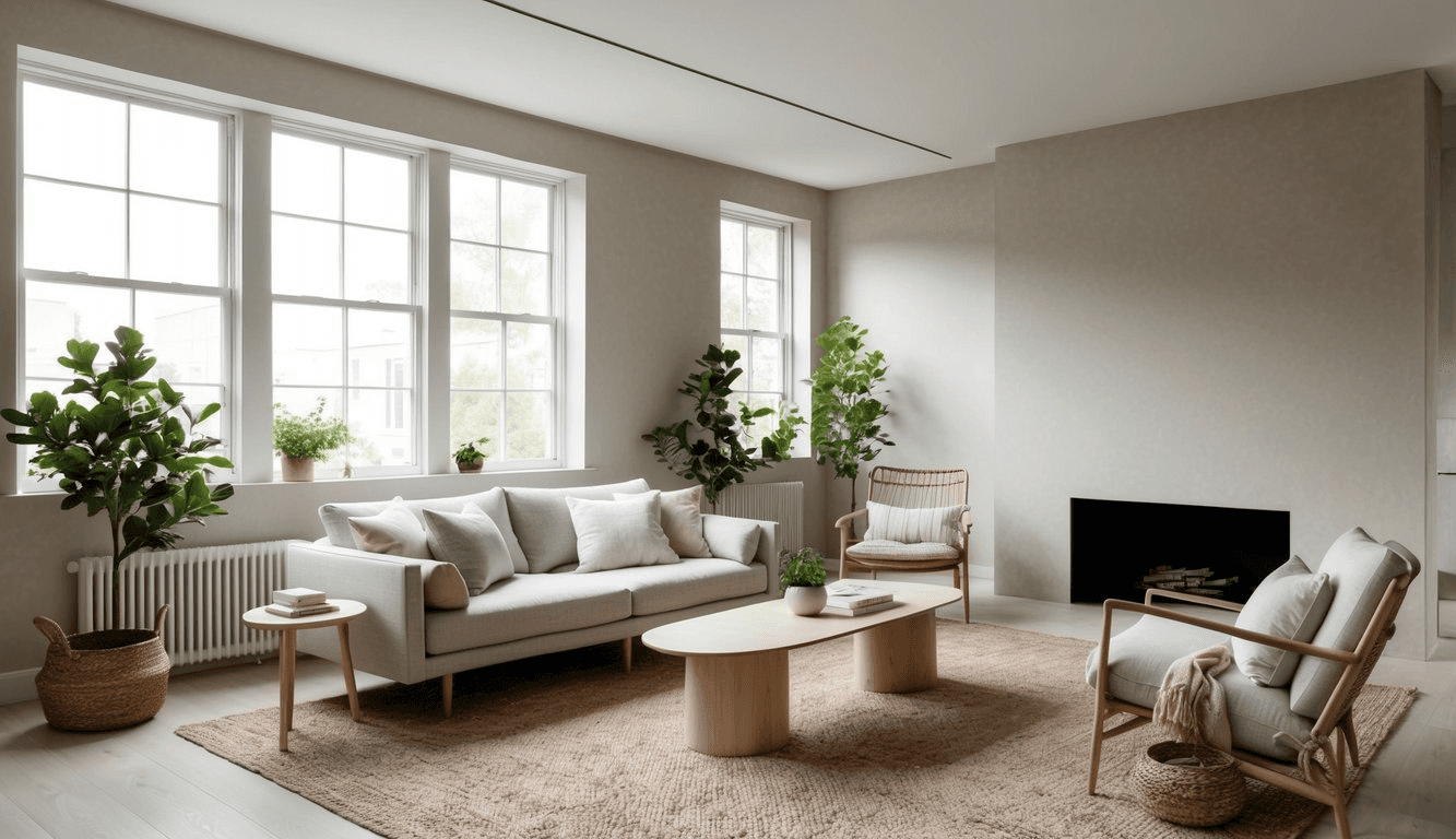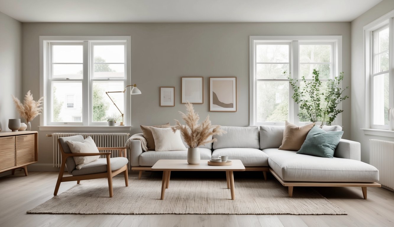 Choose a minimalist sofa in light gray or white. Pair it with sleek wooden coffee and side tables. Incorporate natural elements like potted plants or a statement indoor tree.