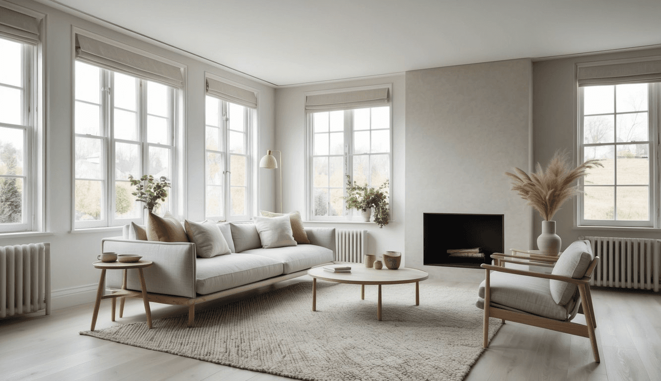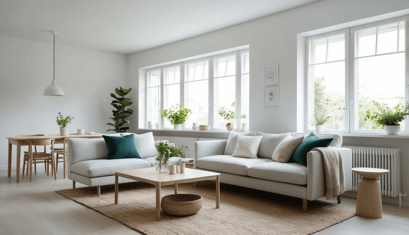 Your living room is the heart of Scandinavian home decor. Keep the color palette neutral with whites, grays, and light woods. Add a cozy touch with textured throw pillows and a plush area rug.