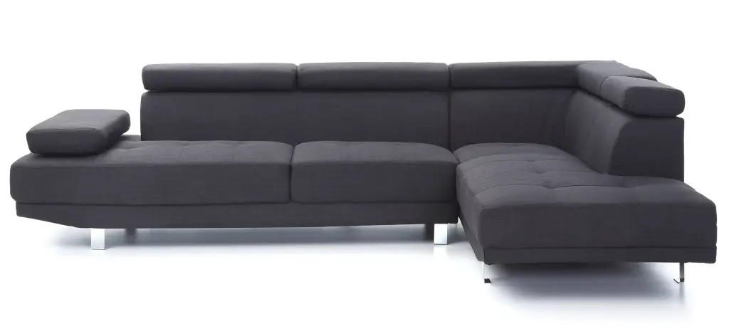 The Riveredge sectional offers sleek low lines, adjustable headrests, and a modern look with chrome legs. Its versatility makes it a standout choice for contemporary living rooms that require both comfort and style.