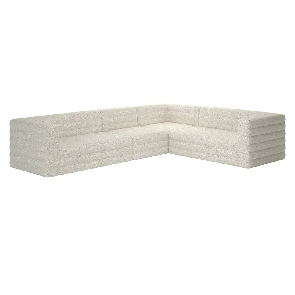 Inspired by vintage '70s design, the Strato sectional combines cozy boucle upholstery with plush channel tufting. Its spacious and inviting design makes it ideal for minimalist or modern decor settings.