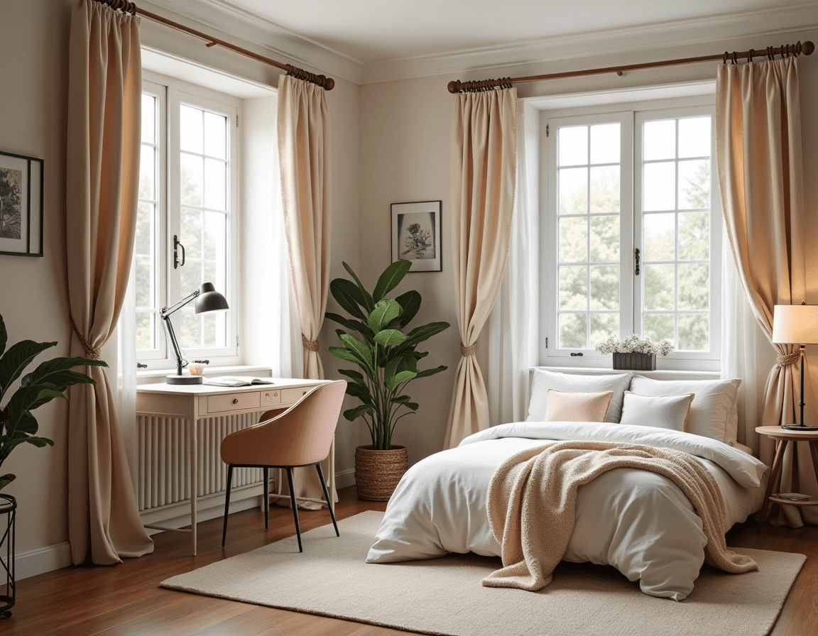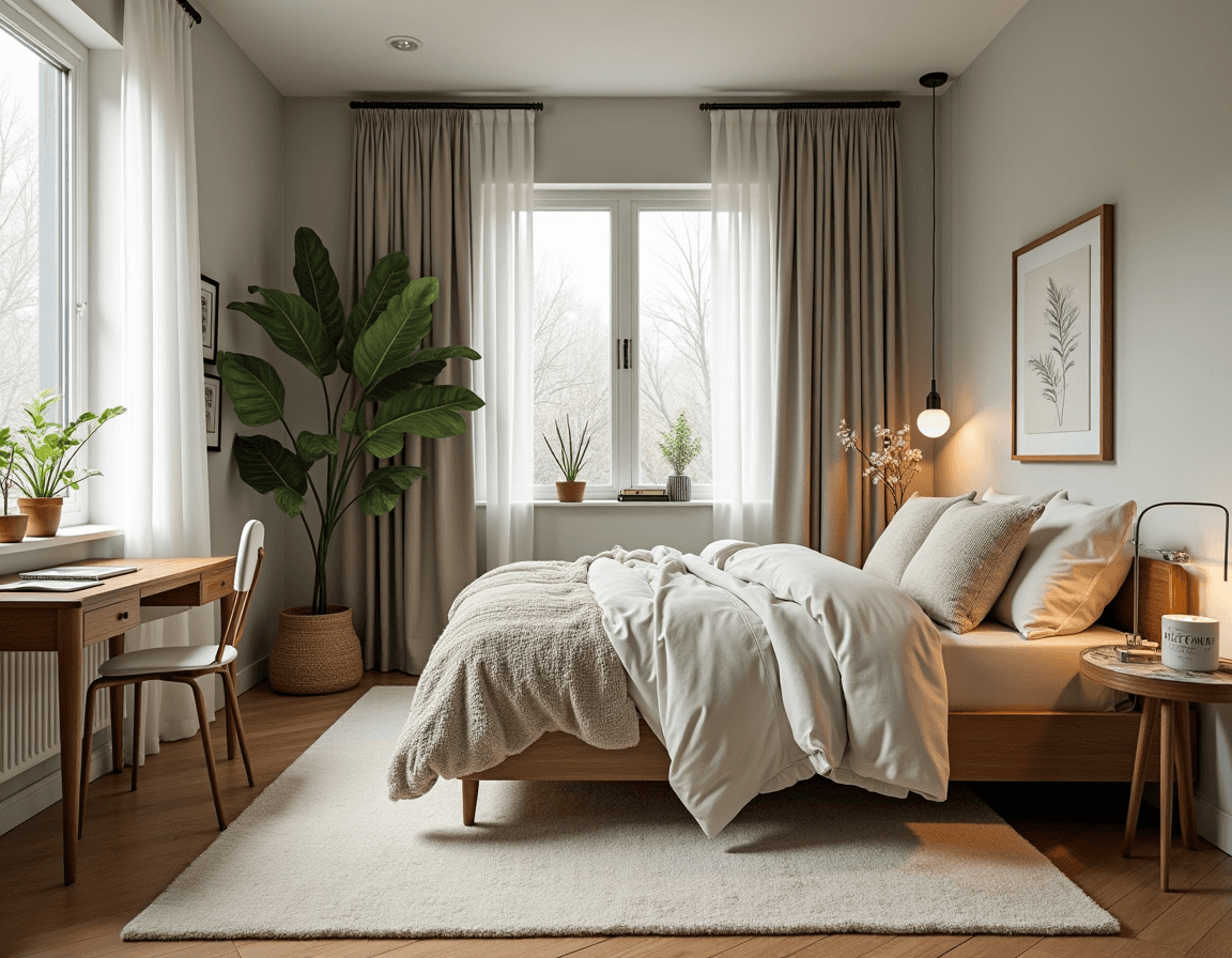 Surround your desk with greenery to soften its presence in the room. Hanging planters and small indoor trees can blend your office setup into the bedroom, creating a vibe that feels natural and calming rather than, well, like work. It’s a great way to add life and texture while gently separating your workspace from your rest space.