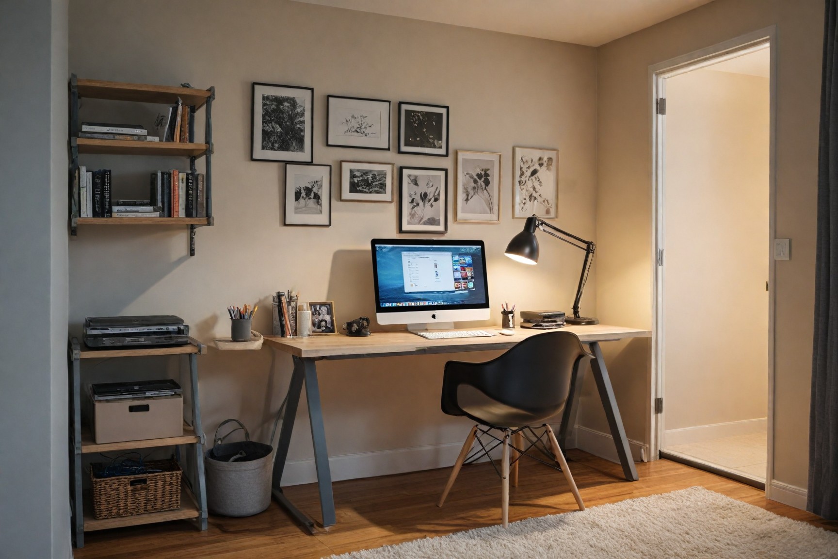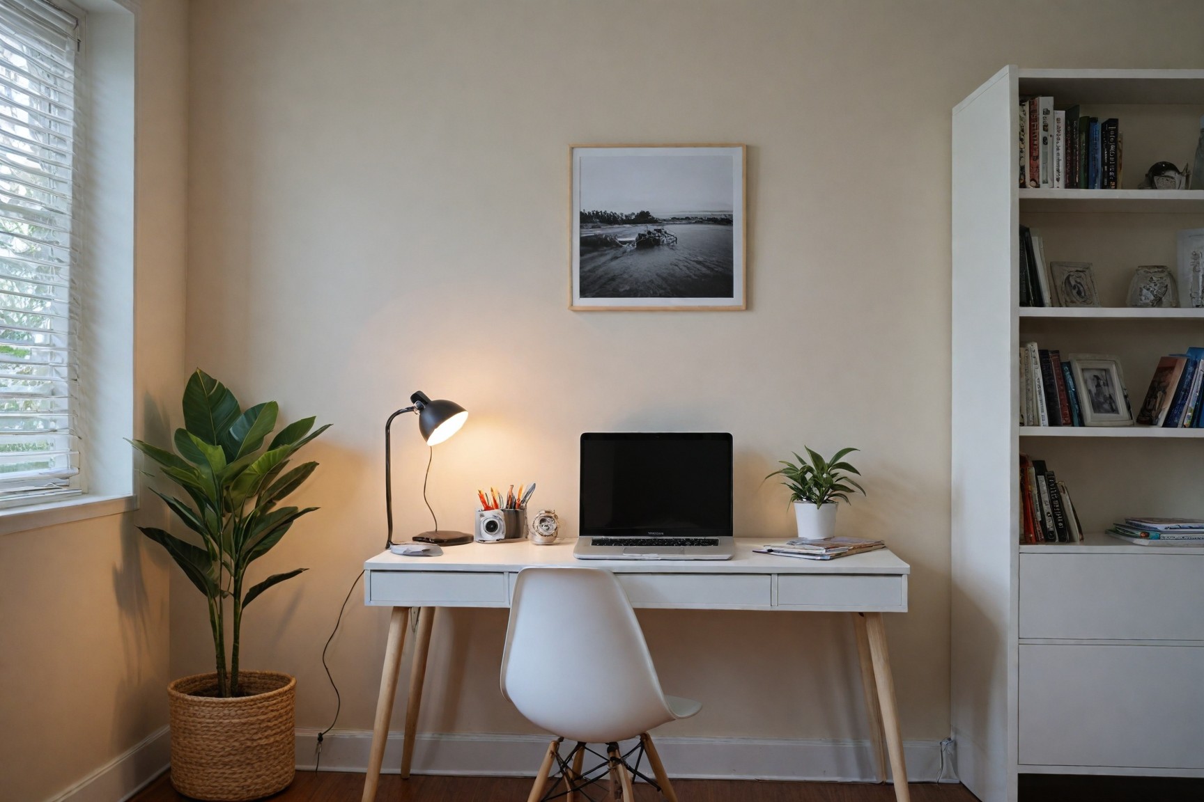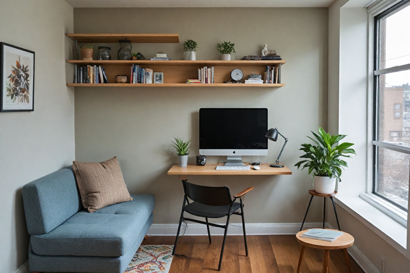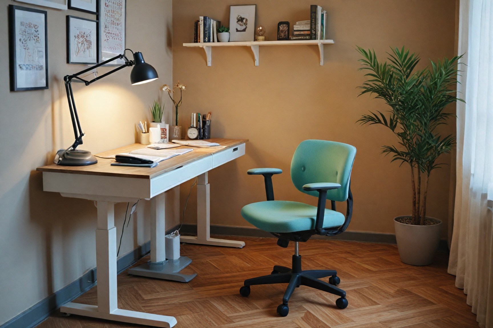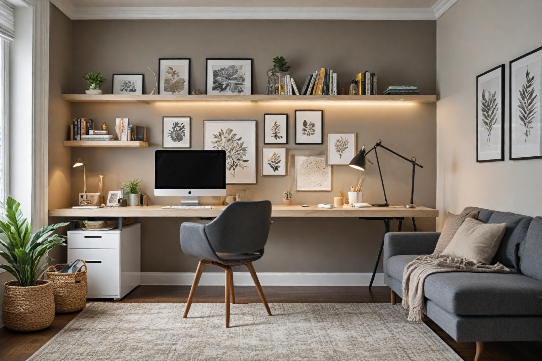 Different colors can affect mood and focus. Soft blues, greens, and muted earth tones are calming background colors for walls, while vibrant accents can stimulate creativity.