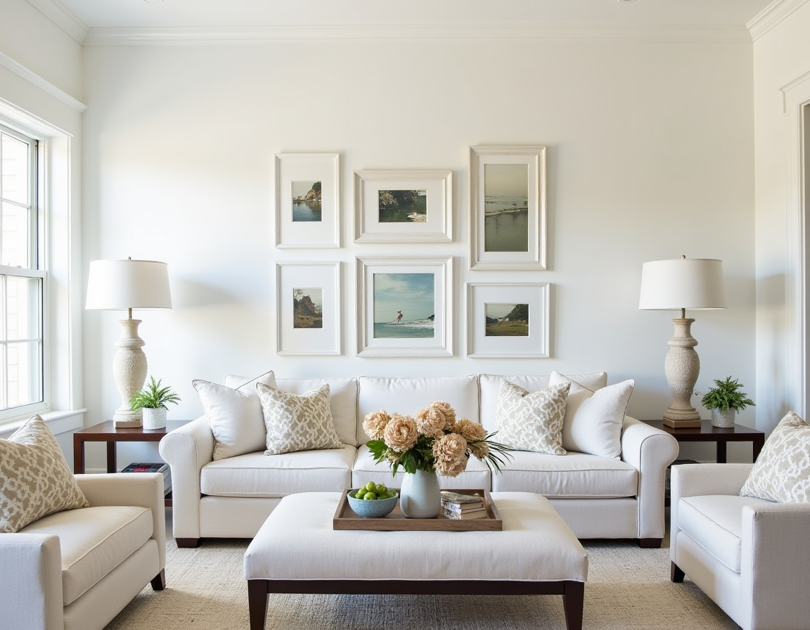 Gallery walls work in most design styles, but for a beachy space, it’s all about setting the right atmosphere. This coastal living room features a series of beachside photographs — windswept dunes, surfers on the shoreline, and sun-bleached boardwalks — that feel like a collection of summer memories. Abstract paintings in blue and yellow hues, seashell prints, and sculptural rattan accents can also capture the laid-back vibe that defines coastal decor.