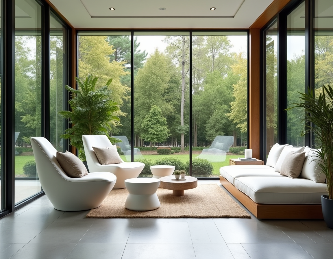 Natural wood may get most of the attention in modern sunrooms — but ceramics deserve a spot, too. With their subtle shine and organic curves, ceramic stools and side tables add earthy charm with a softer, sculptural twist. Here, a pair of ceramic side tables double as ottomans for two retro-inspired accent chairs, breaking up the room’s clean lines and adding just the right touch of contrast.