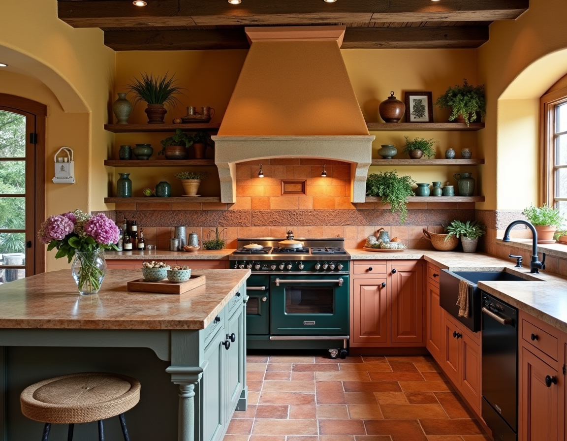 Terracotta tiles make a kitchen feel sun-soaked and worn-in — like it belongs somewhere off a Mediterranean beach or Spanish countryside. The natural variation in color and surface gives them an Old World character that fits right into the rustic style. Paired with ceramic plant pots, wood stools, and an old-school range, the look hits vintage and earthy without feeling overly styled.
