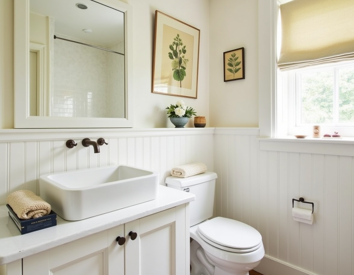 Wainscoting adds structure and subtle dimension — and in smaller bathrooms, it can completely shift the perception of the room entirely. In this cozy space, classic white panels and molding run halfway up the walls, drawing the eye upward and making the ceiling appear taller.